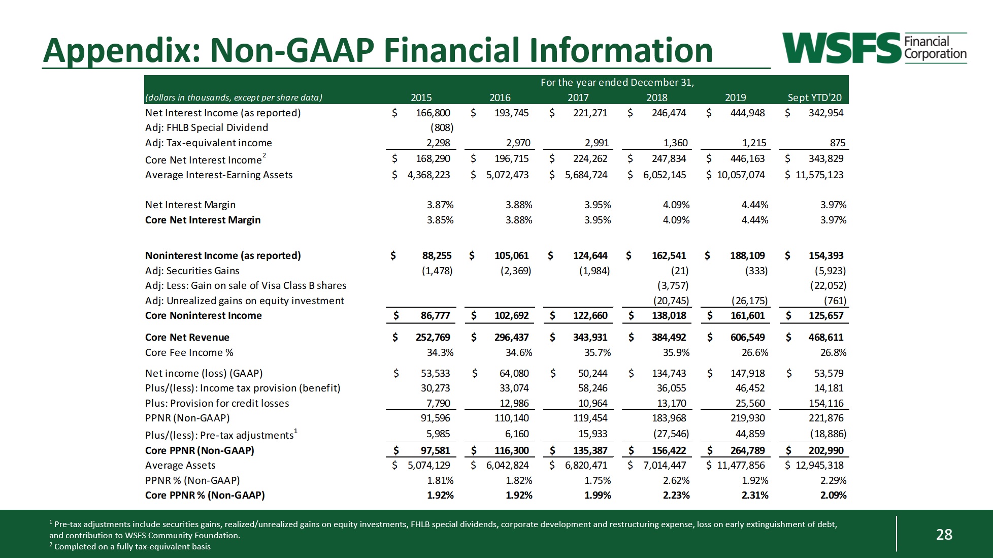 27 Appendix: Non - GAAP Financial Information 1 For details on our core adjustments for full - year 2010 through 2019 refer to each years respective fourth quarter Earnings Rele ase filed at Exhibit 99.1 on Form 8 - K; For details on our core adjustments for YTD September 2020 refer to slide 25. (dollars in thousands, except per share data) 2010 2011 2012 Net Income (GAAP) 14,117$ 22,677$ 31,311$ Adj: Plus/less core (after-tax) 1 420 (2,664) (11,546) Adjusted net income (non-GAAP) 14,537$ 20,013$ 19,765$ Average Assets 3,796,166$ 4,070,896$ 4,267,358$ Core ROA 0.38% 0.49% 0.46% (dollars in thousands, except per share data) 2013 2014 2015 Net Income (GAAP) 46,882$ 53,757$ 53,533$ Adj: Plus/less core (after-tax) 1 (4,290) (4,632) 4,407 Adjusted net income (non-GAAP) 42,592$ 49,125$ 57,940$ Average Assets 4,365,389$ 4,598,121$ 5,074,129$ Core ROA 0.98% 1.07% 1.14% (dollars in thousands, except per share data) 2016 2017 2018 Net Income (GAAP) 64,080$ 50,244$ 134,743$ Adj: Plus/less core (after-tax) 1 4,323 32,597 (20,436) Adjusted net income (non-GAAP) 68,403$ 82,841$ 114,307$ Average Assets 6,042,824$ 6,820,471$ 7,014,447$ Core ROA 1.13% 1.21% 1.63% (dollars in thousands, except per share data) 2019 Sept YTD'20 Net Income (GAAP) 148,809$ 54,961$ Adj: Plus/less core (after-tax) 1 36,295 (15,930) Adjusted net income (non-GAAP) 185,104$ 39,031$ Average Assets 11,477,856$ 12,945,318$ Core ROA 1.61% 0.40% For the year ended December 31, For the year ended December 31, For the year ended December 31, (dollars in thousands, except per share data) GAAP net income (loss) attributable to WSFS $ 51,145 $ 54,961 Plus/less core adjustments (after-tax) 1 (454) (15,930) Adjusted net income (loss) (non-GAAP) attributable to WSFS $ 50,691 $ 39,031 Average stockholders' equity of WSFS Return on average equity (ROE) 11.08% 3.99% Core return on average equity (Non-GAAP) 10.98% 2.84% GAAP net income (loss) attributable to WSFS $ 51,145 $ 54,961 Plus: Tax effected amortization of intangible assets Net tangible income (loss) (non-GAAP) Average stockholders' equity of WSFS Less: average goodwill and intangible assets $ 561,505 $ 564,596 Net average tangible common equity $ 1,274,751 $ 1,273,491 Return on average tangible common equity (non- GAAP) Adjusted net income (loss) (non-GAAP) attributable to WSFS $ 50,691 $ 39,031 Plus: Tax effected amortization of intangible assets Core net tangible income (loss) (non-GAAP) $ 52,781 $ 45,422 Net average tangible common equity $ 1,274,751 $ 1,273,491 Core return on average tangible common equity (non-GAAP) 16.61% 6,391 4.76% Nine Months Ended 61,352 1,838,087 6.44% 2,090 16.47 % Three Months 2,090 53,235 1,836,256 1,836,256 1,838,087 September 30, 2020 6,391 September 30, 2020