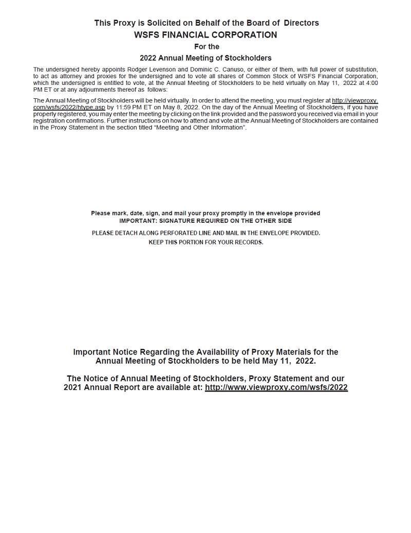This Proxy is Solicited on Behalf of the Board of Directors WSFS FINANCIAL CORPORATION For the 2022 Annual Meeting of Stockholders The undersigned hereby appoints Rodger Levenson and Dominic C. Canuso, or either of them, with full power of substitution, to act as attorney and proxies for the undersigned and to vote all shares of Common Stock of WSFS Financial Corporation, which the undersigned is entitled to vote, at the Annual Meeting of Stockholders to be held virtually on May 11, 2022 at 4:00 PM ET or at any adjournments thereof as follows: The Annual Meeting of Stockholders will be held virtually. In order to attend the meeting, you must register at http://viewproxy. com/wsfs/2022/htype.asp by 11:59 PM ET on May 8, 2022. On the day of the Annual Meeting of Stockholders, if you have properly registered, you may enter the meeting by clicking on the link provided and the password you received via email in your registration confirmations. Further instructions on how to attend and vote at the Annual Meeting of Stockholders are contained in the Proxy Statement in the section titled “Meeting and Other Information”. Please mark, date, sign, and mail your proxy promptly in the envelope provided IMPORTANT: SIGNATURE REQUIRED ON THE OTHER SIDE PLEASE DETACH ALONG PERFORATED LINE AND MAIL IN THE ENVELOPE PROVIDED. KEEP THIS PORTION FOR YOUR RECORDS. Important Notice Regarding the Availability of Proxy Materials for the Annual Meeting of Stockholders to be held May 11, 2022. The Notice of Annual Meeting of Stockholders, Proxy Statement and our 2021 Annual Report are available at: http://www.viewproxy.com/wsfs/2022