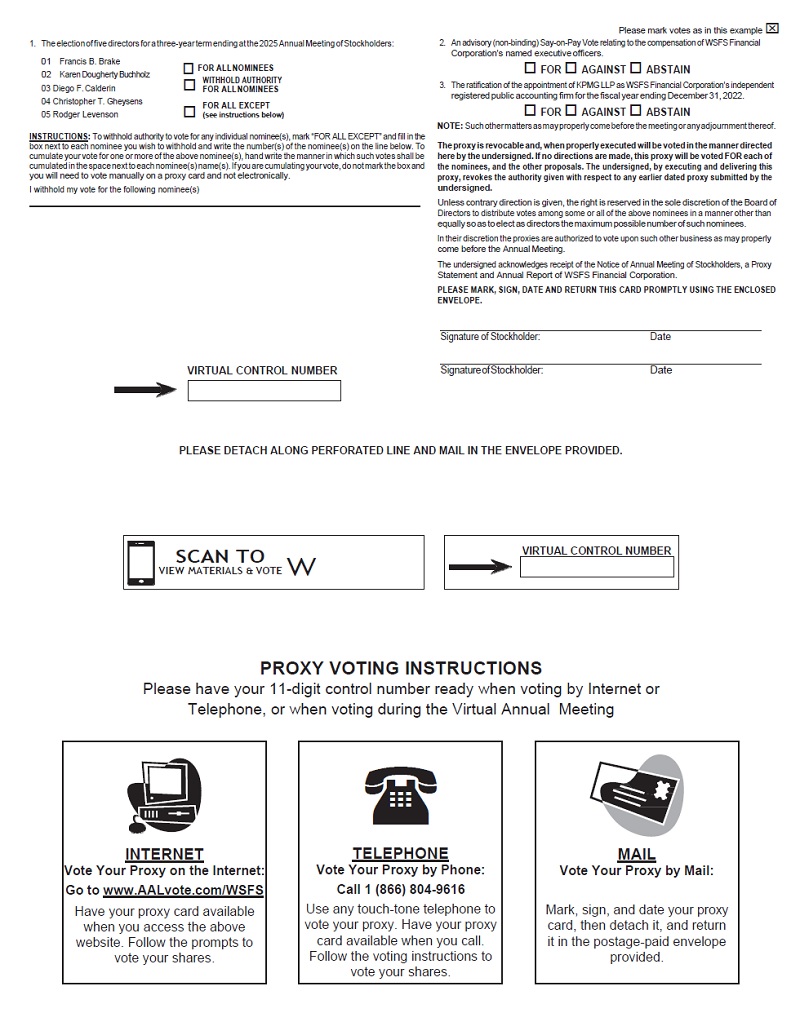1. The election of five directors for a three-year term ending at the 2025 Annual Meeting of Stockholders: Please mark votes as in this example 2. An advisory (non-binding) Say-on-Pay Vote relating to the compensation of WSFS Financial Corporation’s named executive officers. 01 Francis B. Brake 02 Karen Dougherty Buchholz 03 Diego F. Calderin 04 Christopher T. Gheysens 05 Rodger Levenson FOR ALL NOMINEES WITHHOLD AUTHORITY FOR ALL NOMINEES FOR ALL EXCEPT (see instructions below) FOR AGAINST ABSTAIN 3. The ratification of the appointment of KPMG LLP as WSFS Financial Corporation’s independent registered public accounting firm for the fiscal year ending December 31, 2022. FOR AGAINST ABSTAIN NOTE: Such other matters as may properly come before the meeting or any adjournment thereof. INSTRUCTIONS: To withhold authority to vote for any individual nominee(s), mark “FOR ALL EXCEPT” and fill in the box next to each nominee you wish to withhold and write the number(s) of the nominee(s) on the line below. To cumulate your vote for one or more of the above nominee(s), hand write the manner in which such votes shall be cumulated in the space next to each nominee(s) name(s). If you are cumulating your vote, do not mark the box and you will need to vote manually on a proxy card and not electronically. I withhold my vote for the following nominee(s) The proxy is revocable and, when properly executed will be voted in the manner directed here by the undersigned. If no directions are made, this proxy will be voted FOR each of the nominees, and the other proposals. The undersigned, by executing and delivering this proxy, revokes the authority given with respect to any earlier dated proxy submitted by the undersigned. Unless contrary direction is given, the right is reserved in the sole discretion of the Board of Directors to distribute votes among some or all of the above nominees in a manner other than equally so as to elect as directors the maximum possible number of such nominees. ln their discretion the proxies are authorized to vote upon such other business as may properly come before the Annual Meeting. The undersigned acknowledges receipt of the Notice of Annual Meeting of Stockholders, a Proxy Statement and Annual Report of WSFS Financial Corporation. PLEASE MARK, SIGN, DATE AND RETURN THIS CARD PROMPTLY USING THE ENCLOSED ENVELOPE. Signature of Stockholder: Date VIRTUAL CONTROL NUMBER Signature of Stockholder: Date PLEASE DETACH ALONG PERFORATED LINE AND MAIL IN THE ENVELOPE PROVIDED. PROXY VOTING INSTRUCTIONS Please have your 11-digit control number ready when voting by Internet or Telephone, or when voting during the Virtual Annual Meeting SCAN TO VIEW MATERIALS & VOTE w VIRTUAL CONTROL NUMBER INTERNET Vote Your Proxy on the Internet: Go to www.AALvote.com/WSFS Have your proxy card available when you access the above website. Follow the prompts to vote your shares. TELEPHONE Vote Your Proxy by Phone: Call 1 (866) 804-9616 Use any touch-tone telephone to vote your proxy. Have your proxy card available when you call. Follow the voting instructions to vote your shares. MAIL Vote Your Proxy by Mail: Mark, sign, and date your proxy card, then detach it, and return it in the postage-paid envelope provided.