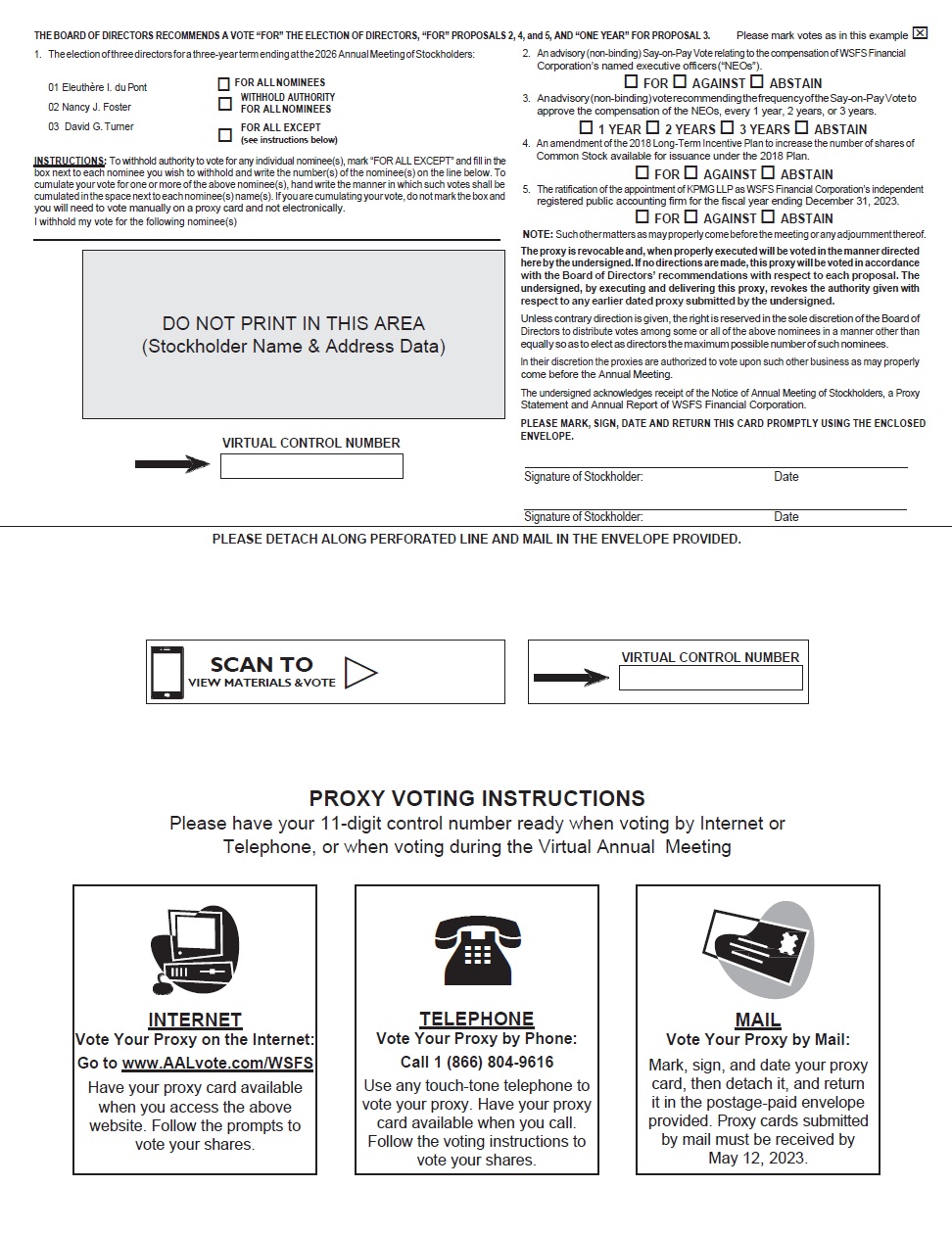 THE BOARD OF DIRECTORS RECOMMENDS A VOTE “FOR” THE ELECTION OF DIRECTORS, “FOR” PROPOSALS 2, 4, and 5, AND “ONE YEAR” FOR PROPOSAL 3. Please mark votes as in this example 1. The election of three directors for a three-year term ending at the 2026 Annual Meeting of Stockholders: 2. An advisory (non-binding) Say-on-Pay Vote relating to the compensation of WSFS Financial Corporation’s named executive officers (“NEOs”). 01 Eleuthère I. du Pont 02 Nancy J. Foster 03 David G. Turner FOR ALL NOMINEES WITHHOLD AUTHORITY FOR ALL NOMINEES FOR ALL EXCEPT (see instructions below) FOR AGAINST ABSTAIN 3. An advisory (non-binding) vote recommending the frequency of the Say-on-Pay Vote to approve the compensation of the NEOs, every 1 year, 2 years, or 3 years. 1 YEAR 2 YEARS 3 YEARS ABSTAIN 4. An amendment of the 2018 Long-Term Incentive Plan to increase the number of shares of INSTRUCTIONS: To withhold authority to vote for any individual nominee(s), mark “FOR ALL EXCEPT” and fill in the box next to each nominee you wish to withhold and write the number(s) of the nominee(s) on the line below. To cumulate your vote for one or more of the above nominee(s), hand write the manner in which such votes shall be cumulated in the space next to each nominee(s) name(s). If you are cumulating your vote, do not mark the box and you will need to vote manually on a proxy card and not electronically. I withhold my vote for the following nominee(s) Common Stock available for issuance under the 2018 Plan. FOR AGAINST ABSTAIN 5. The ratification of the appointment of KPMG LLP as WSFS Financial Corporation’s independent registered public accounting firm for the fiscal year ending December 31, 2023. FOR AGAINST ABSTAIN NOTE: Such other matters as may properly come before the meeting or any adjournment thereof. The proxy is revocable and, when properly executed will be voted in the manner directed here by the undersigned. If no directions are made, this proxy will be voted in accordance with the Board of Directors’ recommendations with respect to each proposal. The undersigned, by executing and delivering this proxy, revokes the authority given with respect to any earlier dated proxy submitted by the undersigned. Unless contrary direction is given, the right is reserved in the sole discretion of the Board of Directors to distribute votes among some or all of the above nominees in a manner other than equally so as to elect as directors the maximum possible number of such nominees. ln their discretion the proxies are authorized to vote upon such other business as may properly come before the Annual Meeting. The undersigned acknowledges receipt of the Notice of Annual Meeting of Stockholders, a Proxy Statement and Annual Report of WSFS Financial Corporation. PLEASE MARK, SIGN, DATE AND RETURN THIS CARD PROMPTLY USING THE ENCLOSED VIRTUAL CONTROL NUMBER ENVELOPE. Signature of Stockholder: Date Signature of Stockholder: Date PLEASE DETACH ALONG PERFORATED LINE AND MAIL IN THE ENVELOPE PROVIDED. PROXY VOTING INSTRUCTIONS Please have your 11-digit control number ready when voting by Internet or Telephone, or when voting during the Virtual Annual Meeting SCAN TO VIEW MATERIALS & VOTE VIRTUAL CONTROL NUMBER INTERNET Vote Your Proxy on the Internet: Go to www.AALvote.com/WSFS Have your proxy card available when you access the above website. Follow the prompts to vote your shares. TELEPHONE Vote Your Proxy by Phone: Call 1 (866) 804-9616 Use any touch-tone telephone to vote your proxy. Have your proxy card available when you call. Follow the voting instructions to vote your shares. MAIL Vote Your Proxy by Mail: Mark, sign, and date your proxy card, then detach it, and return it in the postage-paid envelope provided. Proxy cards submitted by mail must be received by May 12, 2023. DO NOT PRINT IN THIS AREA (Stockholder Name & Address Data)