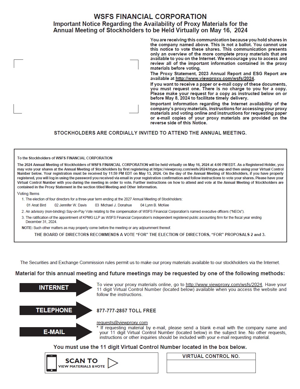 WSFS FINANCIAL CORPORATION Important Notice Regarding the Availability of Proxy Materials for the Annual Meeting of Stockholders to be Held Virtually on May 16, 2024 You are receiving this communication because you hold shares in the company named above. This is not a ballot. You cannot use this notice to vote these shares. This communication presents only an overview of the more complete proxy materials that are available to you on the Internet. We encourage you to access and review all of the important information contained in the proxy materials before voting. The Proxy Statement, 2023 Annual Report and ESG Report are available at http://www.viewproxy.com/wsfs/2024. If you want to receive a paper or e-mail copy of these documents, you must request one. There is no charge to you for a copy. Please make your request for a copy as instructed below on or before May 8, 2024 to facilitate timely delivery. Important information regarding the Internet availability of the company’s proxy materials, instructions for accessing your proxy materials and voting online and instructions for requesting paper or e-mail copies of your proxy materials are provided on the reverse side of this Notice. STOCKHOLDERS ARE CORDIALLY INVITED TO ATTEND THE ANNUAL MEETING. The Securities and Exchange Commission rules permit us to make our proxy materials available to our stockholders via the Internet. Material for this annual meeting and future meetings may be requested by one of the following methods: To view your proxy materials online, go to http://www.viewproxy.com/wsfs/2024. Have your 11 digit Virtual Control Number (located below) available when you access the website and follow the instructions. 877-777-2857 TOLL FREE requests@viewproxy.com * If requesting material by e-mail, please send a blank e-mail with the company name and your 11 digit Virtual Control Number (located below) in the subject line. No other requests, instructions or other inquiries should be included with your e-mail requesting material. You must use the 11 digit Virtual Control Number located in the box below. To the Stockholders of WSFS FINANCIAL CORPORATION The 2024 Annual Meeting of Stockholders of WSFS FINANCIAL CORPORATION will be held virtually on May 16, 2024 at 4:00 PM EDT. As a Registered Holder, you may vote your shares at the Annual Meeting of Stockholders by first registering at https://viewproxy.com/wsfs/2024/htype.asp and then using your Virtual Control Number below. Your registration must be received by 11:59 PM EDT on May 13, 2024. On the day of the Annual Meeting of Stockholders, if you have properly registered, you will log in using the password you received via email in your registration confirmation and follow instructions to vote your shares. Please have your Virtual Control Number with you during the meeting in order to vote. Further instructions on how to attend and vote at the Annual Meeting of Stockholders are contained in the Proxy Statement in the section titled Meeting and Other Information. Voting Items 1. The election of four directors for a three-year term ending at the 2027 Annual Meeting of Stockholders: 01 Anat Bird 02 Jennifer W. Davis 03 Michael J. Donahue 04 Lynn B. McKee 2. An advisory (non-binding) Say-on-Pay Vote relating to the compensation of WSFS Financial Corporation’s named executive officers (“NEOs”). 3. The ratification of the appointment of KPMG LLP as WSFS Financial Corporation’s independent registered public accounting firm for the fiscal year ending December 31, 2024. NOTE: Such other matters as may properly come before the meeting or any adjournment thereof. THE BOARD OF DIRECTORS RECOMMENDS A VOTE “FOR” THE ELECTION OF DIRECTORS, “FOR” PROPOSALS 2 and 3. VIRTUAL CONTROL NO. INTERNET TELEPHONE E-MAIL SCAN TO VIEW MATERIALS & VOTE