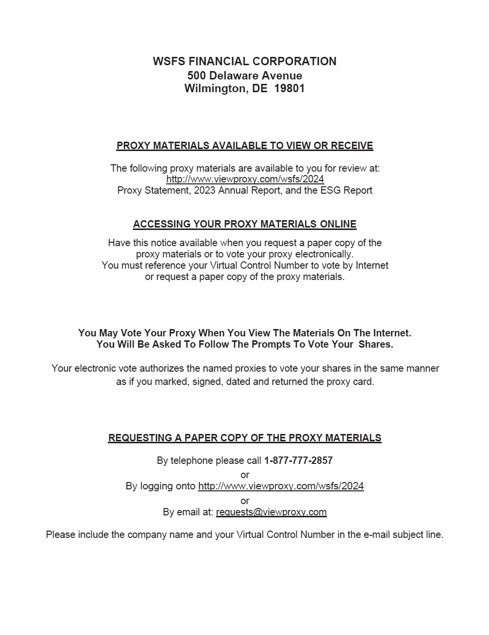 WSFS FINANCIAL CORPORATION 500 Delaware Avenue Wilmington, DE 19801 PROXY MATERIALS AVAILABLE TO VIEW OR RECEIVE The following proxy materials are available to you for review at: http://www.viewproxy.com/wsfs/2024 Proxy Statement, 2023 Annual Report, and the ESG Report ACCESSING YOUR PROXY MATERIALS ONLINE Have this notice available when you request a paper copy of the proxy materials or to vote your proxy electronically. You must reference your Virtual Control Number to vote by Internet or request a paper copy of the proxy materials. You May Vote Your Proxy When You View The Materials On The Internet. You Will Be Asked To Follow The Prompts To Vote Your Shares. Your electronic vote authorizes the named proxies to vote your shares in the same manner as if you marked, signed, dated and returned the proxy card. REQUESTING A PAPER COPY OF THE PROXY MATERIALS By telephone please call 1-877-777-2857 or By logging onto http://www.viewproxy.com/wsfs/2024 or By email at: requests@viewproxy.com Please include the company name and your Virtual Control Number in the e-mail subject line.