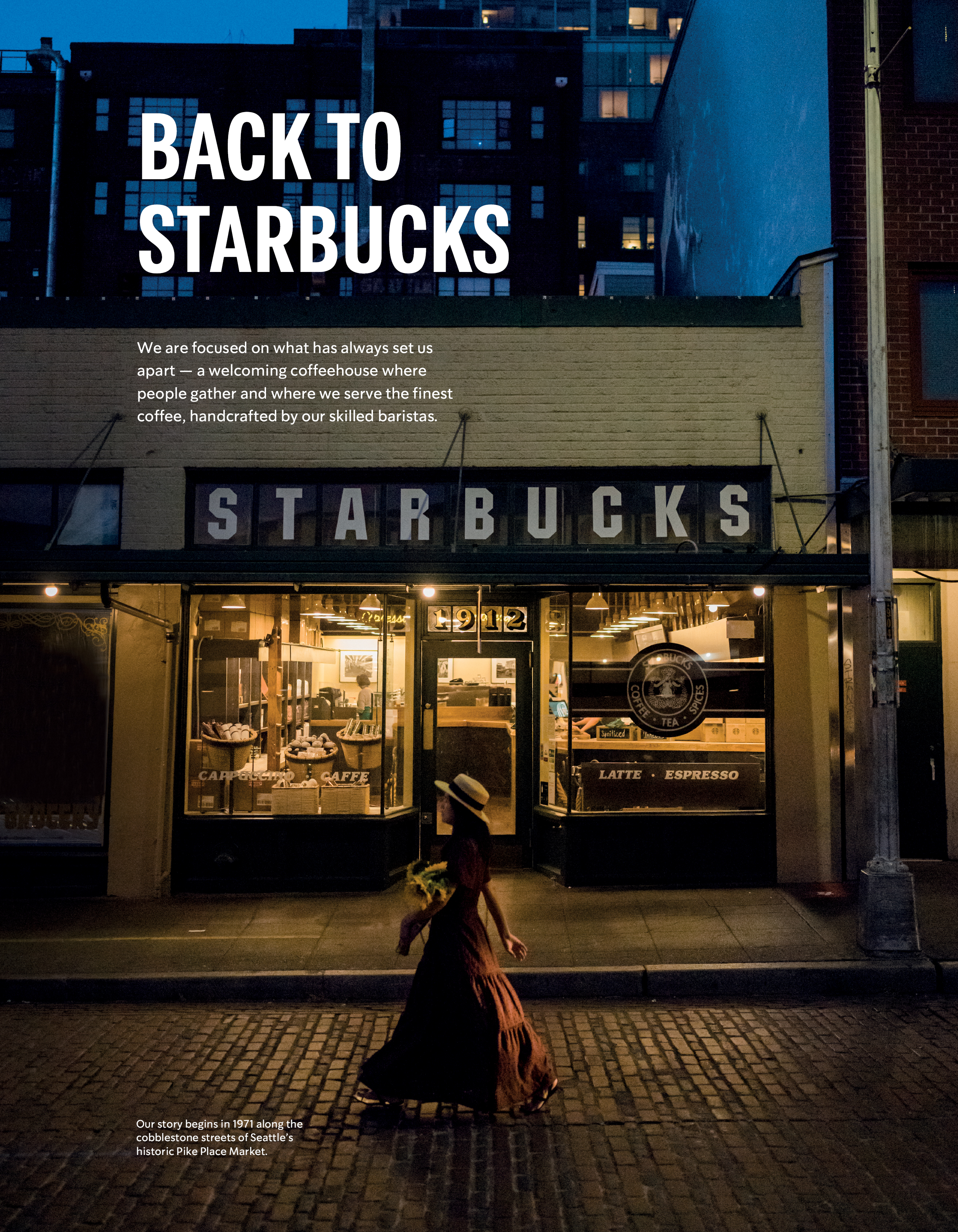 Back to Starbucks Refocusing on what has always set us apart—a welcoming coffeehouse where people gather and where we serve the finest coffee, handcrafted by our skilled baristas. The first Starbucks store on Pike Place in Seattle, Washington