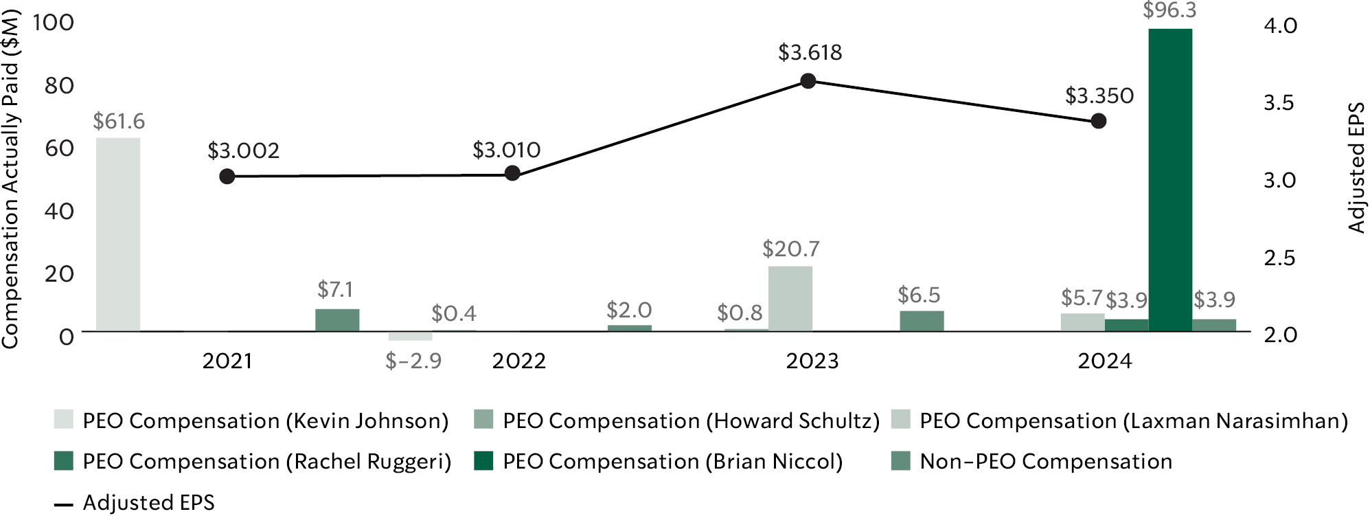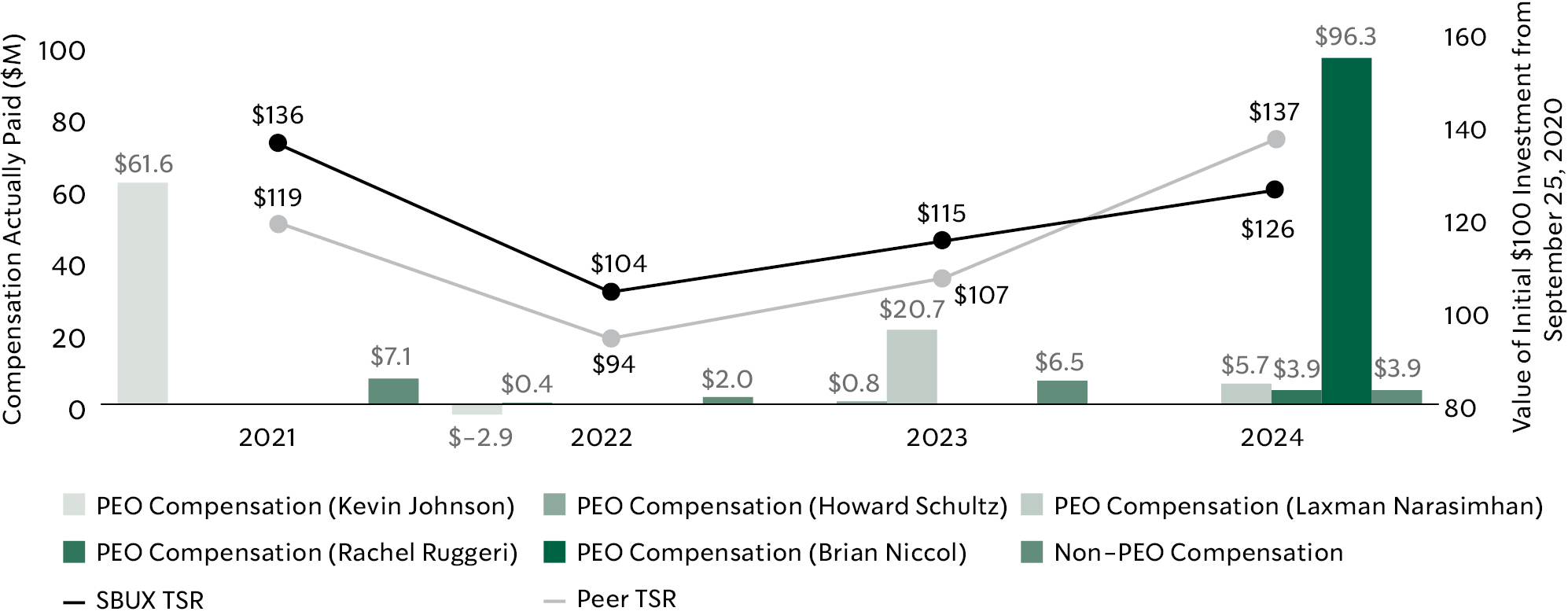This proxy statement includes forward-looking statements within the meaning of the Private Securities Litigation Reform Act of 1995. All statements contained in this proxy statement other than statements of historical fact, including statements relating to trends in or expectations relating to the expected effects of our initiatives, strategies, and plans, as well as trends in or expectations regarding our financial results, costs and expenses, dividend issuances and share repurchases, and long-term growth model and drivers, and regarding our business strategy and plans such as our “Back to Starbucks” strategy, and our objectives for future operations are forward-looking statements. Words such as “believes”, “expects”, “anticipates”, “estimates”, “intends”, “plans”, “seeks”, or words of similar meaning, or future or conditional verbs, such as “will”, “should”, “could”, “may”, “aims”, “intends”, or “projects”, and similar expressions are intended to identify forward-looking statements, although not all forward-looking statements contain these identifying words. We have based these forward-looking statements largely on our current assumptions, expectations, and projections about future events and trends. These statements are subject to a variety of risks, uncertainties, and other factors (many beyond our control) that could cause our actual results to differ materially from our historical experience or from our current expectations or projections. These risks and uncertainties related thereto include, but are not limited to, the risks detailed in our filings with the Securities and Exchange Commission (the “SEC”), including the Risk Factors section of our Annual Report on Form 10-K for the fiscal year ended September 29, 2024. New risks periodically emerge. It is not possible for our management to predict all risks, nor can we assess the impact of all factors on our business or the extent to which any factor, or combination of factors, may cause actual results to differ materially from those contained in any forward-looking statements we may make. In light of these risks, uncertainties, and assumptions, the future events and trends discussed in this proxy statement may not occur and actual results could differ materially and adversely from those anticipated or implied in the forward-looking statements. You should not rely upon forward-looking statements as predictions of future events. The events and circumstances reflected in the forward-looking statements may not be achieved or occur. Although we believe that the expectations reflected in the forward-looking statements are reasonable, we cannot guarantee future results. We assume no obligation to update or alter any of these forward-looking statements after the date of this proxy statement, except as may be required by law. Given these risks and uncertainties, readers are cautioned not to place undue reliance on such forward-looking statements.