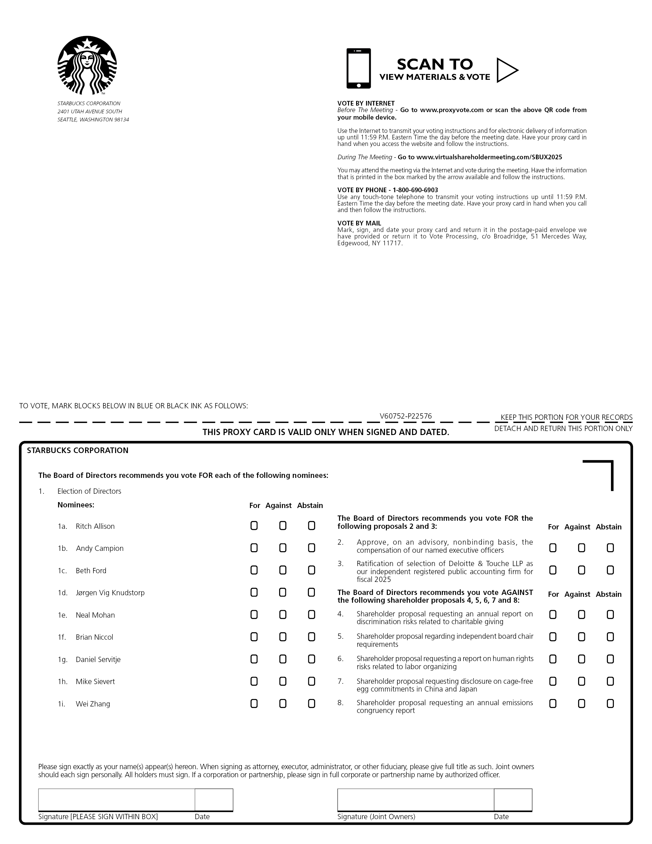 SCAN TO VIEW MATERIALS & VOTE STARBUCKS CORPORATION 2401 UTAH AVENUE SOUTH SEATTLE, WASHINGTON 98134 VOTE BY INTERNET Before The Meeting - Go to www.proxyvote.com or scan the above QR code from your mobile device. Use the Internet to transmit your voting instructions and for electronic delivery of information up until 11:59 P.M. Eastern Time the day before the meeting date. Have your proxy card in hand when you access the website and follow the instructions. During The Meeting - Go to www.virtualshareholdermeeting.com/SBUX2025 You may attend the meeting via the Internet and vote during the meeting. Have the information that is printed in the box marked by the arrow available and follow the instructions. VOTE BY PHONE - 1-800-690-6903 Use any touch-tone telephone to transmit your voting instructions up until 11:59 P.M. Eastern Time the day before the meeting date. Have your proxy card in hand when you call and then follow the instructions. VOTE BY MAIL Mark, sign, and date your proxy card and return it in the postage-paid envelope we have provided or return it to Vote Processing, c/o Broadridge, 51 Mercedes Way, Edgewood, NY 11717. TO VOTE, MARK BLOCKS BELOW IN BLUE OR BLACK INK AS FOLLOWS: V60752-P22576 KEEP THIS PORTION FOR YOUR RECORDS THIS PROXY CARD IS VALID ONLY WHEN SIGNED AND DATED. DETACH AND RETURN THIS PORTION ONLY STARBUCKS CORPORATION The Board of Directors recommends you vote FOR each of the following nominees: 1. Election of Directors Nominees: 1a. Ritch Allison 1b. Andy Campion 1c. Beth Ford 1d. Jørgen Vig Knudstorp 1e. Neal Mohan 1f. Brian Niccol 1g. Daniel Servitje 1h. Mike Sievert 1i. Wei Zhang For Against Abstain The Board of Directors recommends you vote FOR the following proposals 2 and 3: 2. Approve, on an advisory, nonbinding basis, the compensation of our named executive officers 3. Ratification of selection of Deloitte & Touche LLP as our independent registered public accounting firm for fiscal 2025 The Board of Directors recommends you vote AGAINST the following shareholder proposals 4, 5, 6, 7 and 8: 4. Shareholder proposal requesting an annual report on discrimination risks related to charitable giving 5. Shareholder proposal regarding independent board chair requirements 6. Shareholder proposal requesting a report on human rights risks related to labor organizing 7. Shareholder proposal requesting disclosure on cage-free egg commitments in China and Japan 8. Shareholder proposal requesting an annual emissions congruency report Please sign exactly as your name(s) appear(s) hereon. When signing as attorney, executor, administrator, or other fiduciary, please give full title as such. Joint owners should each sign personally. All holders must sign. If a corporation or partnership, please sign in full corporate or partnership name by authorized officer. Signature [PLEASE SIGN WITHIN BOX] Date Signature (Joint Owners)