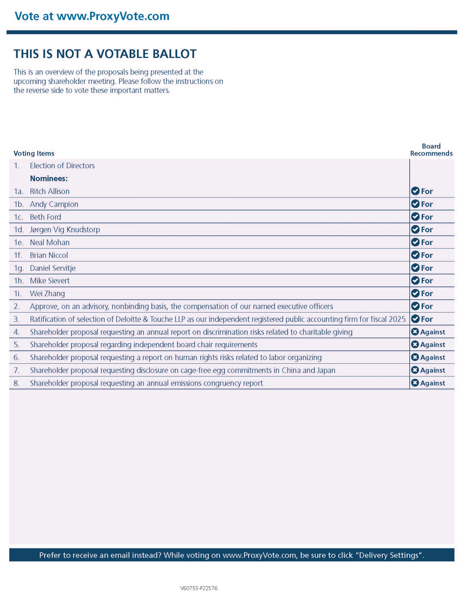 Vote at www.ProxyVote.com THIS IS NOT A VOTABLE BALLOT This is an overview of the proposals being presented at the upcoming shareholder meeting. Please follow the instructions on the reverse side to vote these important matters. Prefer to receive an email instead? While voting on www.ProxyVote.com, be sure to click “Delivery Settings”. For 1. Election of Directors Nominees: 1a. Ritch Allison For 1b. Andy Campion For 1c. Beth Ford For 1d. Jørgen Vig Knudstorp For 1e. Neal Mohan For 1f. Brian Niccol For 1g. Daniel Servitje For 1h. Mike Sievert For 1i. Wei Zhang For 2. Approve, on an advisory, nonbinding basis, the compensation of our named executive officers For 3. Ratification of selection of Deloitte & Touche LLP as our independent registered public accounting firm for fiscal 2025 Against 4. Shareholder proposal requesting an annual report on discrimination risks related to charitable giving Against 5. Shareholder proposal regarding independent board chair requirements Against 6. Shareholder proposal requesting a report on human rights risks related to labor organizing Against 7. Shareholder proposal requesting disclosure on cage - free egg commitments in China and Japan Against 8. Shareholder proposal requesting an annual emissions congruency report Voting Items Board Recommends V60755 - P22576