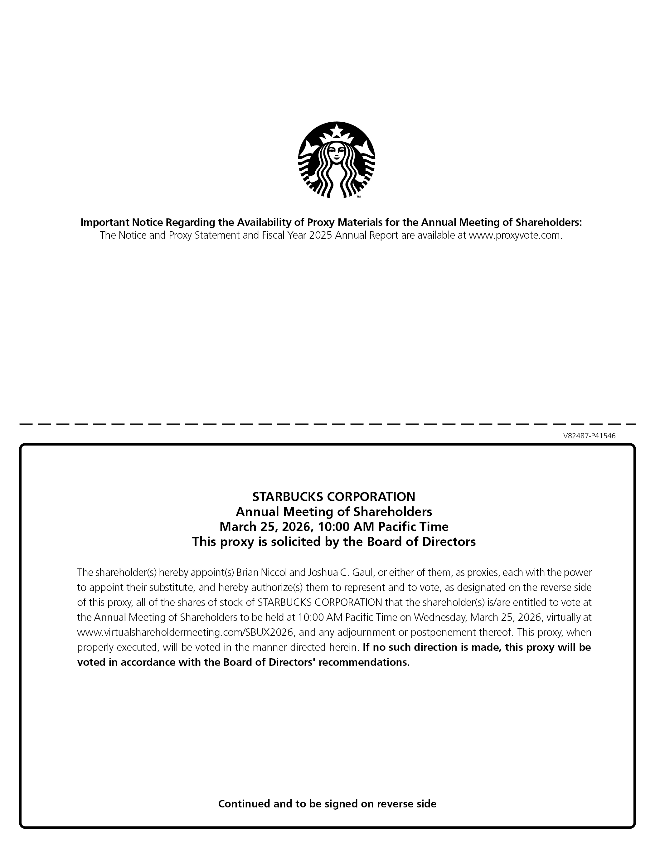 Important Notice Regarding the Availability of Proxy Materials for the Annual Meeting of Shareholders: The Notice and Proxy Statement and Fiscal Year 2025 Annual Report are available at www.proxyvote.com. V82487-P41546 STARBUCKS CORPORATION Annual Meeting of Shareholders March 25, 2026, 10:00 AM Pacific Time This proxy is solicited by the Board of Directors The shareholder(s) hereby appoint(s) Brian Niccol and Joshua C. Gaul, or either of them, as proxies, each with the power to appoint their substitute, and hereby authorize(s) them to represent and to vote, as designated on the reverse side of this proxy, all of the shares of stock of STARBUCKS CORPORATION that the shareholder(s) is/are entitled to vote at the Annual Meeting of Shareholders to be held at 10:00 AM Pacific Time on Wednesday, March 25, 2026, virtually at www.virtualshareholdermeeting.com/SBUX2026, and any adjournment or postponement thereof. This proxy, when properly executed, will be voted in the manner directed herein. If no such direction is made, this proxy will be voted in accordance with the Board of Directors’ recommendations. Continued and to be signed on reverse side