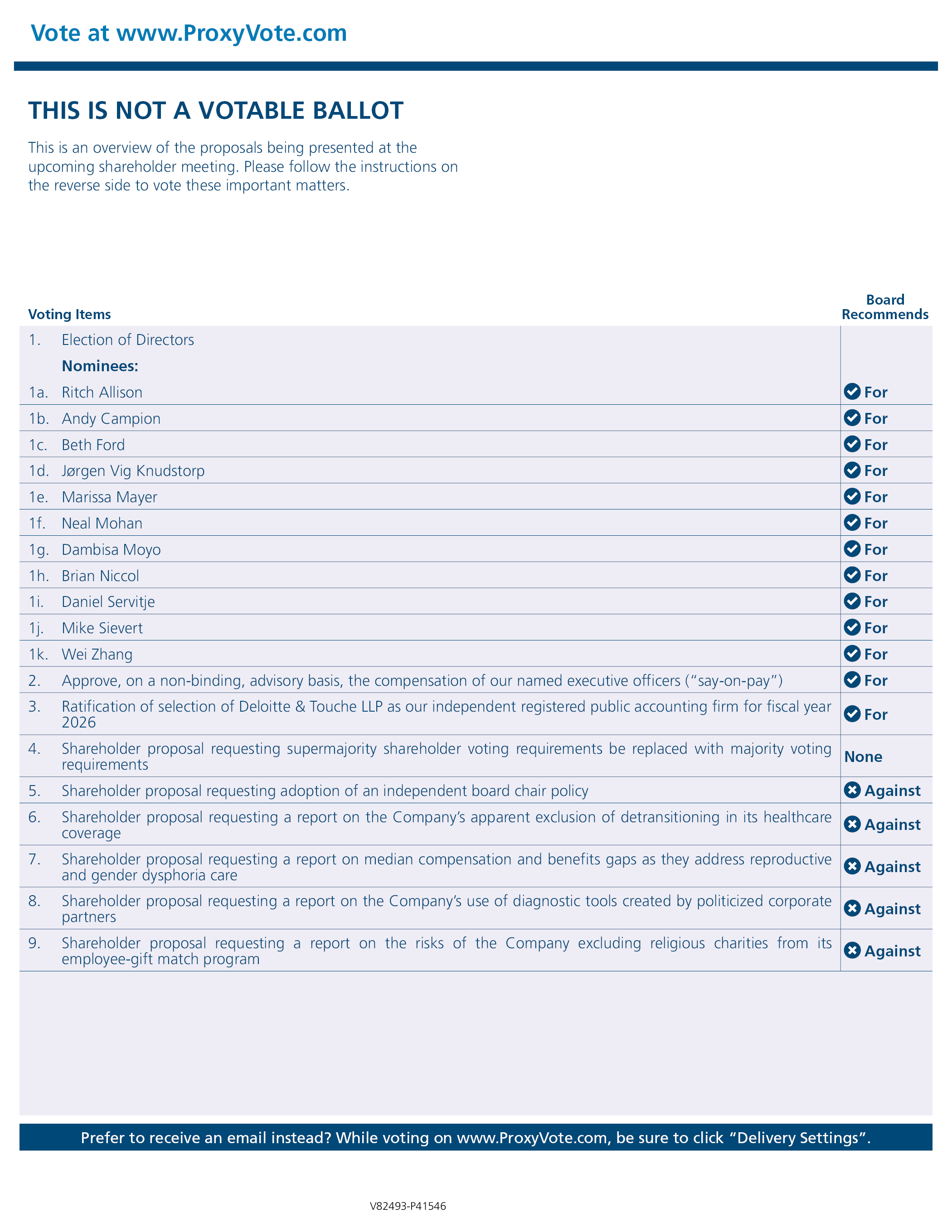 Vote at www.ProxyVote.com THIS IS NOT A VOTABLE BALLOT This is an overview of the proposals being presented at the upcoming shareholder meeting. Please follow the instructions on the reverse side to vote these important matters. Prefer to receive an email instead? While voting on www.ProxyVote.com, be sure to click “Delivery Settings”. Voting Items Board Recommends V82493-P41546 1. Election of Directors Nominees: 1a. Ritch Allison For 1b. Andy Campion For 1c. Beth Ford For 1d. Jørgen Vig Knudstorp For 1e. Marissa Mayer For 1f. Neal Mohan For 1g. Dambisa Moyo For 1h. Brian Niccol For 1i. Daniel Servitje For 1j. Mike Sievert For 1k. Wei Zhang For 2. Approve, on a non-binding, advisory basis, the compensation of our named executive officers (“say-on-pay”) For 3. Ratification of selection of Deloitte & Touche LLP as our independent registered public accounting firm for fiscal year 2026 For 4. Shareholder proposal requesting supermajority shareholder voting requirements be replaced with majority voting requirements None 5. Shareholder proposal requesting adoption of an independent board chair policy Against 6. Shareholder proposal requesting a report on the Company’s apparent exclusion of detransitioning in its healthcare coverage Against 7. Shareholder proposal requesting a report on median compensation and benefits gaps as they address reproductive and gender dysphoria care Against 8. Shareholder proposal requesting a report on the Company’s use of diagnostic tools created by politicized corporate partners Against 9. Shareholder proposal requesting a report on the risks of the Company excluding religious charities from its employee-gift match program Against