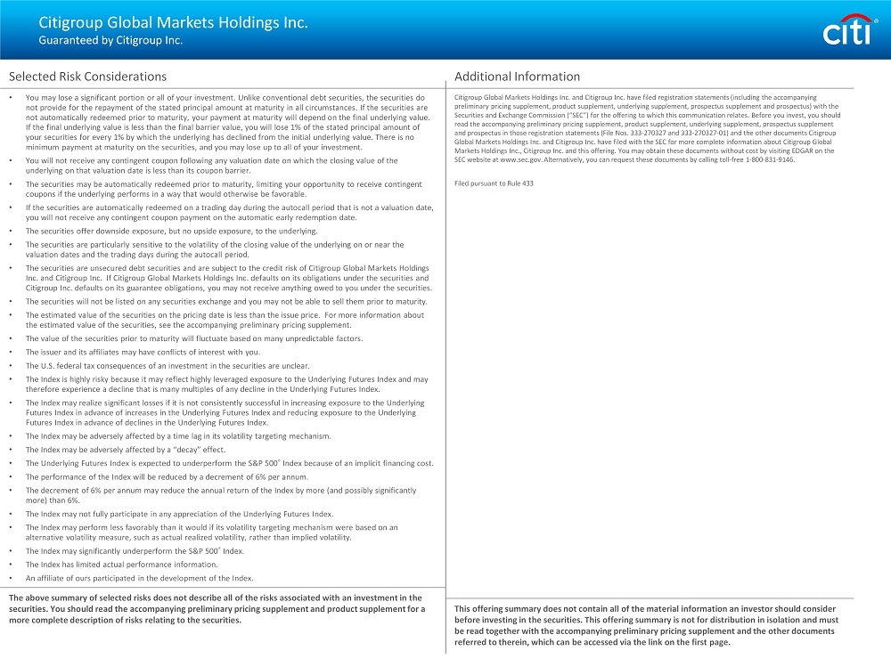 Selected Risk Considerations • You may lose a significant portion or all of your investment. Unlike conventional debt securities, the securities do not provide for the repayment of the stated principal amount at maturity in all circumstances. If the securities are not automatically redeemed prior to maturity, your payment at maturity will depend on the final underlying value. If the final underlying value is less than the final barrier value, you will lose 1% of the stated principal amount of your securities for every 1% by which the underlying has declined from the initial underlying value. There is no minimum payment at maturity on the securities, and you may lose up to all of your investment. • You will not receive any contingent coupon following any valuation date on which the closing value of the underlying on that valuation date is less than its coupon barrier. • The securities may be automatically redeemed prior to maturity, limiting your opportunity to receive contingent coupons if the underlying performs in a way that would otherwise be favorable. • If the securities are automatically redeemed on a trading day during the autocall period that is not a valuation date, you will not receive any contingent coupon payment on the automatic early redemption date. • The securities offer downside exposure, but no upside exposure, to the underlying. • The securities are particularly sensitive to the volatility of the closing value of the underlying on or near the valuation dates and the trading days during the autocall period. • The securities are unsecured debt securities and are subject to the credit risk of Citigroup Global Markets Holdings Inc. and Citigroup Inc. If Citigroup Global Markets Holdings Inc. defaults on its obligations under the securities and Citigroup Inc. defaults on its guarantee obligations, you may not receive anything owed to you under the securities. • The securities will not be listed on any securities exchange and you may not be able to sell them prior to maturity. • The estimated value of the securities on the pricing date is less than the issue price. For more information about the estimated value of the securities, see the accompanying preliminary pricing supplement. • The value of the securities prior to maturity will fluctuate based on many unpredictable factors. • The issuer and its affiliates may have conflicts of interest with you. • The U.S. federal tax consequences of an investment in the securities are unclear. • The Index is highly risky because it may reflect highly leveraged exposure to the Underlying Futures Index and may therefore experience a decline that is many multiples of any decline in the Underlying Futures Index. • The Index may realize significant losses if it is not consistently successful in increasing exposure to the Underlying Futures Index in advance of increases in the Underlying Futures Index and reducing exposure to the Underlying Futures Index in advance of declines in the Underlying Futures Index. • The Index may be adversely affected by a time lag in its volatility targeting mechanism. • The Index may be adversely affected by a “decay” effect. • The Underlying Futures Index is expected to underperform the S&P 500 ® Index because of an implicit financing cost. • The performance of the Index will be reduced by a decrement of 6% per annum. • The decrement of 6% per annum may reduce the annual return of the Index by more (and possibly significantly more) than 6%. • The Index may not fully participate in any appreciation of the Underlying Futures Index. • The Index may perform less favorably than it would if its volatility targeting mechanism were based on an alternative volatility measure, such as actual realized volatility, rather than implied volatility. • The Index may significantly underperform the S&P 500 ® Index. • The Index has limited actual performance information. • An affiliate of ours participated in the development of the Index. The above summary of selected risks does not describe all of the risks associated with an investment in the securities. You should read the accompanying preliminary pricing supplement and product supplement for a more complete description of risks relating to the securities. Additional Information Citigroup Global Markets Holdings Inc. and Citigroup Inc. have filed registration statements (including the accompanying preliminary pricing supplement, product supplement, underlying supplement, prospectus supplement and prospectus) with the Securities and Exchange Commission (“SEC”) for the offering to which this communication relates. Before you invest, you shoul d read the accompanying preliminary pricing supplement, product supplement, underlying supplement, prospectus supplement and prospectus in those registration statements (File Nos. 333 - 270327 and 333 - 270327 - 01) and the other documents Citigroup Global Markets Holdings Inc. and Citigroup Inc. have filed with the SEC for more complete information about Citigroup Global Markets Holdings Inc., Citigroup Inc. and this offering. You may obtain these documents without cost by visiting EDGAR on the SEC website at www.sec.gov. Alternatively, you can request these documents by calling toll - free 1 - 800 - 831 - 9146. Filed pursuant to Rule 433 This offering summary does not contain all of the material information an investor should consider before investing in the securities. This offering summary is not for distribution in isolation and must be read together with the accompanying preliminary pricing supplement and the other documents referred to therein, which can be accessed via the link on the first page. Citigroup Global Markets Holdings Inc. Guaranteed by Citigroup Inc.