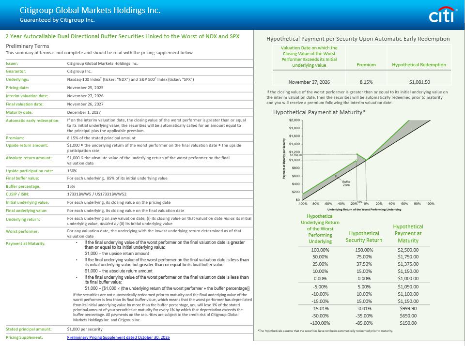 Hypothetical Redemption Premium Valuation Date on which the Closing Value of the Worst Performer Exceeds its Initial Underlying Value $1,081.50 8.15% November 27, 2026 Preliminary Terms This summary of terms is not complete and should be read with the pricing supplement below Citigroup Global Markets Holdings Inc. Issuer: Citigroup Inc. Guarantor: Nasdaq - 100 Index ® (ticker: “NDX”) and S&P 500 ® Index (ticker: “SPX”) Underlyings : November 25, 2025 Pricing date: November 27, 2026 Interim valuation date: November 26, 2027 Final valuation date: December 1, 2027 Maturity date: If on the interim valuation date, the closing value of the worst performer is greater than or equal to its initial underlying value, the securities will be automatically called for an amount equal to the principal plus the applicable premium. Automatic early redemption: 8.15% of the stated principal amount Premium : $1,000 × the underlying return of the worst performer on the final valuation date × the upside participation rate Upside return amount: $1,000 × the absolute value of the underlying return of the worst performer on the final valuation date Absolute return amount: 150% Upside participation rate: For each underlying, 85% of its initial underlying value Final buffer value: 15% Buffer percentage: 17331BWW5 / US17331BWW52 CUSIP / ISIN: For each underlying, its closing value on the pricing date Initial underlying value: For each underlying, its closing value on the final valuation date Final underlying value: For each underlying on any valuation date, ( i ) its closing value on that valuation date minus its initial underlying value, divided by (ii) its initial underlying value Underlying return: For any valuation date, the underlying with the lowest underlying return determined as of that valuation date Worst performer: • If the final underlying value of the worst performer on the final valuation date is greater than or equal to its initial underlying value: $1,000 + the upside return amount • If the final underlying value of the worst performer on the final valuation date is less than its initial underlying value but greater than or equal to its final buffer value: $1,000 + the absolute return amount • If the final underlying value of the worst performer on the final valuation date is less than its final buffer value: $1,000 + [$1,000 × (the underlying return of the worst performer + the buffer percentage)] If the securities are not automatically redeemed prior to maturity and the final underlying value of the worst performer is less than its final buffer value, which means that the worst performer has depreciated from its initial underlying value by more than the buffer percentage, you will lose 1% of the stated principal amount of your securities at maturity for every 1% by which that depreciation exceeds the buffer percentage. All payments on the securities are subject to the credit risk of Citigroup Global Markets Holdings Inc. and Citigroup Inc. Payment at Maturity: $1,000 per security Stated principal amount: Preliminary Pricing Supplement dated October 30, 2025 Pricing Supplement: Citigroup Global Markets Holdings Inc. Guaranteed by Citigroup Inc. 2 Year Autocallable Dual Directional Buffer Securities Linked to the Worst of NDX and SPX Hypothetical Payment at Maturity* Hypothetical Payment at Maturity Hypothetical Security Return Hypothetical Underlying Return of the Worst Performing Underlying $2,500.00 150.00% 100.00% $1,750.00 75.00% 50.00% $1,375.00 37.50% 25.00% $1,150.00 15.00% 10.00% $1,000.00 0.00% 0.00% $1,050.00 5.00% - 5.00% $1,100.00 10.00% - 10.00% $1,150.00 15.00% - 15.00% $999.90 - 0.01% - 15.01% $650.00 - 35.00% - 50.00% $150.00 - 85.00% - 100.00% *The hypotheticals assume that the securities have not been automatically redeemed prior to maturity. If the closing value of the worst performer is greater than or equal to its initial underlying value on the interim valuation date, then the securities will be automatically redeemed prior to maturity and you will receive a premium following the interim valuation date. Hypothetical Payment per Security Upon Automatic Early Redemption