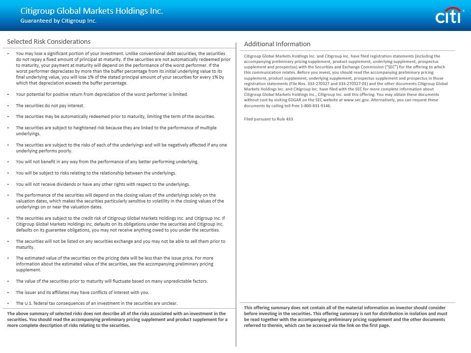 Selected Risk Considerations • You may lose a significant portion of your investment. Unlike conventional debt securities, the securities do not repay a fixed amount of principal at maturity. If the securities are not automatically redeemed prior to maturity, your payment at maturity will depend on the performance of the worst performer. If the worst performer depreciates by more than the buffer percentage from its initial underlying value to its final underlying value, you will lose 1% of the stated principal amount of your securities for every 1% by which that depreciation exceeds the buffer percentage. • Your potential for positive return from depreciation of the worst performer is limited. • The securities do not pay interest. • The securities may be automatically redeemed prior to maturity, limiting the term of the securities. • The securities are subject to heightened risk because they are linked to the performance of multiple underlyings . • The securities are subject to the risks of each of the underlyings and will be negatively affected if any one underlying performs poorly. • You will not benefit in any way from the performance of any better performing underlying. • You will be subject to risks relating to the relationship between the underlyings . • You will not receive dividends or have any other rights with respect to the underlyings . • The performance of the securities will depend on the closing values of the underlyings solely on the valuation dates, which makes the securities particularly sensitive to volatility in the closing values of the underlyings on or near the valuation dates. • The securities are subject to the credit risk of Citigroup Global Markets Holdings Inc. and Citigroup Inc. If Citigroup Global Markets Holdings Inc. defaults on its obligations under the securities and Citigroup Inc. defaults on its guarantee obligations, you may not receive anything owed to you under the securities. • The securities will not be listed on any securities exchange and you may not be able to sell them prior to maturity. • The estimated value of the securities on the pricing date will be less than the issue price. For more information about the estimated value of the securities, see the accompanying preliminary pricing supplement. • The value of the securities prior to maturity will fluctuate based on many unpredictable factors. • The issuer and its affiliates may have conflicts of interest with you. • The U.S. federal tax consequences of an investment in the securities are unclear. The above summary of selected risks does not describe all of the risks associated with an investment in the securities. You should read the accompanying preliminary pricing supplement and product supplement for a more complete description of risks relating to the securities. Additional Information Citigroup Global Markets Holdings Inc. and Citigroup Inc. have filed registration statements (including the accompanying preliminary pricing supplement, product supplement, underlying supplement, prospectus supplement and prospectus) with the Securities and Exchange Commission (“SEC”) for the offering to which this communication relates. Before you invest, you should read the accompanying preliminary pricing supplement, product supplement, underlying supplement, prospectus supplement and prospectus in those registration statements (File Nos. 333 - 270327 and 333 - 270327 - 01) and the other documents Citigroup Global Markets Holdings Inc. and Citigroup Inc. have filed with the SEC for more complete information about Citigroup Global Markets Holdings Inc., Citigroup Inc. and this offering. You may obtain these documents without cost by visiting EDGAR on the SEC website at www.sec.gov. Alternatively, you can request these documents by calling toll - free 1 - 800 - 831 - 9146. Filed pursuant to Rule 433 This offering summary does not contain all of the material information an investor should consider before investing in the securities. This offering summary is not for distribution in isolation and must be read together with the accompanying preliminary pricing supplement and the other documents referred to therein, which can be accessed via the link on the first page. Citigroup Global Markets Holdings Inc. Guaranteed by Citigroup Inc.