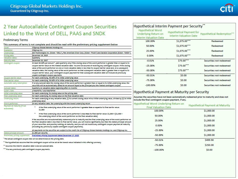 Citigroup Global Markets Holdings Inc. Guaranteed by Citigroup Inc. 2 Year Autocallable Contingent Coupon Securities Linked to the Worst of DELL, PAAS and SNDK Preliminary Terms This summary of terms is not complete and should be read with the preliminary pricing supplement below Citigroup Global Markets Holdings Inc. Issuer: Citigroup Inc. Guarantor: Dell Technologies Inc. (ticker: “DELL”), Pan American Silver Corp. (ticker: “PAAS”) and Sandisk Corporation (ticker: “SNDK”) Underlyings: December 19, 2025 Pricing date: Quarterly Valuation dates: December 22, 2027 Maturity date: At least 30.00% per annum*, paid quarterly only if the closing value of the worst performer is greater than or equal to its coupon barrier value on the related valuation date. You are not assured of receiving any contingent coupon. If the closing value of the worst performer on one or more valuation dates is less than its coupon barrier value and, on a subsequent valuation date, the closing value of the worst performer on that subsequent valuation date is greater than or equal to its coupon barrier value, your contingent coupon payment for that subsequent valuation date will include all previously unpaid contingent coupon payments Contingent coupon: For each underlying, 50.00% of its initial underlying value Coupon barrier value: For each underlying, 50.00% of its initial underlying value Final barrier value: If on any autocall date the closing value of the worst performer is greater than or equal to its initial underlying value, the securities will be automatically called for an amount equal to the principal plus the related contingent coupon Automatic early redemption: Quarterly on valuation dates beginning after six months Autocall dates: 17332TDT3 / US17332TDT34 CUSIP / ISIN: For each underlying, its closing value on the pricing date Initial underlying value: For each underlying, its closing value on the final valuation date Final underlying value: For each underlying on any valuation date, (i) its current closing value minus initial underlying value, divided by (ii) its initial underlying value Underlying return: On any valuation date, the underlying with the lowest underlying return Worst performer: • If the final underlying value of the worst performer is greater than or equal to its final barrier value: $1,000 • If the final underlying value of the worst performer is less than its final barrier value: $1,000 + ($1,000 п the underlying return of the worst performer on the final valuation date) If the securities are not automatically redeemed prior to maturity and the final underlying value of the worst performer on the final valuation date is less than its final barrier value, you will receive significantly less than the stated principal amount of your securities, and possibly nothing, at maturity, and you will not receive any contingent coupon payment at maturity (including any previously unpaid contingent coupon payments). All payments on the securities are subject to the credit risk of Citigroup Global Markets Holdings Inc. and Citigroup Inc. Payment at maturity (if not autocalled): $1,000 per security Stated principal amount: Preliminary Pricing Supplement dated December 17, 2025 Preliminary pricing supplement: * The actual contingent coupon rate will be determined on the pricing date. ** The hypotheticals assume that the contingent coupon will be set at the lowest value indicated in this offering summary. *** Assumes the interim valuation date is also an autocall date. **** Plus any previously paid contingent coupon payments. Hypothetical Interim Payment per Security ** Hypothetical Worst Underlying Return on Interim Valuation Date Hypothetical Payment for Interim Valuation Date Hypothetical Redemption *** 100.00% 50.00% 25.00% 0.00% $1,075.00 **** $1,075.00 **** $1,075.00 **** $1,075.00 **** Red e e m e d Red e e m e d Red e e m e d Red e e m e d - 0.01% - 25. 0 0% - 50. 0 0% $75.00 **** $75.00 **** $75.00 **** Securities not redeemed Securities not redeemed Securities not redeemed - 50.01% - 75.00% - 100 . 00% #101547391v2 $0.00 $0.00 $0.00 Securities not redeemed Securities not redeemed Securities not redeemed urn on Final Valuation Date 100.00% 50.00% 25.00% 0.00% - 25.00% - 50.00% - 50.01% - 75.00% - 100.00% Hypothetical Payment at Maturity per Security Assumes the securities have not been automatically redeemed prior to maturity and does not include the final contingent coupon payment, if any. Hypothetical Worst Underlying Ret