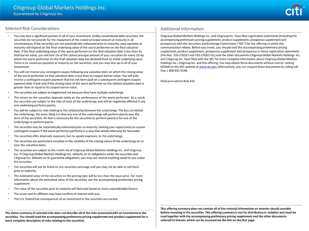 Citigroup Global Markets Holdings Inc. Guaranteed by Citigroup Inc. #101547391v2 Selected Risk Considerations • You may lose a significant portion or all of your investment. Unlike conventional debt securities, the securities do not provide for the repayment of the stated principal amount at maturity in all circumstances. If the securities are not automatically redeemed prior to maturity, your payment at maturity will depend on the final underlying value of the worst performer on the final valuation date. If the final underlying value of the worst performer on the final valuation date is less than its final barrier value, you will lose 1% of the stated principal amount of your securities for every 1% by which the worst performer on the final valuation date has declined from its initial underlying value. There is no minimum payment at maturity on the securities, and you may lose up to all of your investment. • You will not receive any contingent coupon following any valuation date on which the closing value of the worst performer on that valuation date is less than its coupon barrier value. You will only receive a contingent coupon payment that has not been paid on a subsequent contingent coupon payment date if and only if the closing value of the worst performer on the related valuation date is greater than or equal to its coupon barrier value. • The securities are subject to heightened risk because they have multiple underlyings. • The return on the securities depends solely on the performance of the worst performer . As a result, the securities are subject to the risks of each of the underlyings and will be negatively affected if any one underlying performs poorly . • You will be subject to risks relating to the relationship between the underlyings. The less correlated the underlyings, the more likely it is that any one of the underlyings will perform poorly over the term of the securities. All that is necessary for the securities to perform poorly is for one of the underlyings to perform poorly. • The securities may be automatically redeemed prior to maturity, limiting your opportunity to receive contingent coupons if the worst performer performs in a way that would otherwise be favorable. • The securities offer downside exposure, but no upside exposure, to the underlyings. • The securities are particularly sensitive to the volatility of the closing values of the underlyings on or near the valuation dates. • The securities are subject to the credit risk of Citigroup Global Markets Holdings Inc. and Citigroup Inc. If Citigroup Global Markets Holdings Inc. defaults on its obligations under the securities and Citigroup Inc. defaults on its guarantee obligations, you may not receive anything owed to you under the securities. • The securities will not be listed on any securities exchange and you may not be able to sell them prior to maturity. • The estimated value of the securities on the pricing date will be less than the issue price . For more information about the estimated value of the securities, see the accompanying preliminary pricing supplement . • The value of the securities prior to maturity will fluctuate based on many unpredictable factors . • The issuer and its affiliates may have conflicts of interest with you . • The U . S . federal tax consequences of an investment in the securities are unclear . The above summary of selected risks does not describe all of the risks associated with an investment in the securities. You should read the accompanying preliminary pricing supplement and product supplement for a more complete description of risks relating to the securities. Additional Information Citigroup Global Markets Holdings Inc. and Citigroup Inc. have filed registration statements (including the accompanying preliminary pricing supplement, product supplement, prospectus supplement and prospectus) with the Securities and Exchange Commission (“SEC”) for the offering to which this communication relates. Before you invest, you should read the accompanying preliminary pricing supplement, product supplement, prospectus supplement and prospectus in those registration statements (File Nos. 333 - 270327 and 333 - 270327 - 01) and the other documents Citigroup Global Markets Holdings Inc. and Citigroup Inc. have filed with the SEC for more complete information about Citigroup Global Markets Holdings Inc., Citigroup Inc. and this offering. You may obtain these documents without cost by visiting EDGAR on the SEC website at www.sec.gov. Alternatively, you can request these documents by calling toll - free 1 - 800 - 831 - 9146. Filed pursuant to Rule 433 This offering summary does not contain all of the material information an investor should consider before investing in the securities. This offering summary is not for distribution in isolation and must be read together with the accompanying preliminary pricing supplement and the other documents referred to therein, which can be accessed via the link on the first page.