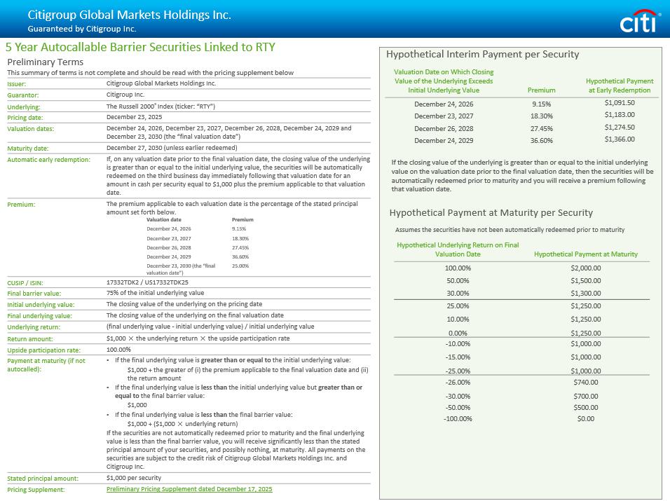 Preliminary Terms This summary of terms is not complete and should be read with the pricing supplement below Citigroup Global Markets Holdings Inc. Issuer: Citigroup Inc. Guarantor: The Russell 2000 ® Index (ticker: “RTY”) Underlying: December 23, 2025 Pricing date: December 24, 2026, December 23, 2027, December 26, 2028, December 24, 2029 and December 23, 2030 (the “final valuation date”) Valuation dates: December 27, 2030 (unless earlier redeemed) Maturity date: If, on any valuation date prior to the final valuation date, the closing value of the underlying is greater than or equal to the initial underlying value, the securities will be automatically redeemed on the third business day immediately following that valuation date for an amount in cash per security equal to $1,000 plus the premium applicable to that valuation date. Automatic early redemption: The premium applicable to each valuation date is the percentage of the stated principal amount set forth below. Premium: 17332TDK2 / US17332TDK25 CUSIP / ISIN: 75% of the initial underlying value Final barrier value: The closing value of the underlying on the pricing date Initial underlying value: The closing value of the underlying on the final valuation date Final underlying value: (final underlying value - initial underlying value) / initial underlying value Underlying return: $1,000 × the underlying return × the upside participation rate Return amount: 100.00% Upside participation rate: • If the final underlying value is greater than or equal to the initial underlying value: $1,000 + the greater of ( i ) the premium applicable to the final valuation date and (ii) the return amount • If the final underlying value is less than the initial underlying value but greater than or equal to the final barrier value : $1,000 • If the final underlying value is less than the final barrier value: $1,000 + ($1,000 × underlying return) If the securities are not automatically redeemed prior to maturity and the final underlying value is less than the final barrier value, you will receive significantly less than the stated principal amount of your securities, and possibly nothing, at maturity. All payments on the securities are subject to the credit risk of Citigroup Global Markets Holdings Inc. and Citigroup Inc. Payment at maturity (if not autocalled): $1,000 per security Stated principal amount: Preliminary Pricing Supplement dated December 17, 2025 Pricing Supplement: Citigroup Global Markets Holdings Inc. Guaranteed by Citigroup Inc. 5 Year Autocallable Barrier Securities Linked to RTY Hypothetical Interim Payment per Security Hypothetical Payment at Maturity Hypothetical Underlying Return on Final Valuation Date $2,000.00 100.00% $1,500.00 50.00% $1,300.00 30.00% $1,250.00 25.00% $1,250.00 $1,250.00 10.00% 0.00% $1,000.00 - 10.00% $1,000.00 $1,000.00 - 15.00% - 25.00% $740.00 $700.00 - 26.00% - 30.00% $500.00 - 50.00% $0.00 - 100.00% Hypothetical Payment at Early Redemption Premium Valuation Date on Which Closing Value of the Underlying Exceeds Initial Underlying Value $1,091.50 $1,183.00 $1,274.50 $1,366.00 9.15% 18.30% 27.45% 36.60% December 24, 2026 December 23 , 2027 December 26, 2028 December 24, 2029 If the closing value of the underlying is greater than or equal to the initial underlying value on the valuation date prior to the final valuation date, then the securities will be automatically redeemed prior to maturity and you will receive a premium following that valuation date. Hypothetical Payment at Maturity per Security Assumes the securities have not been automatically redeemed prior to maturity Premium Valuation date 9.15% December 24, 2026 18.30% December 23, 2027 27.45% December 26, 2028 36.60% December 24, 2029 25.00% December 23, 2030 (the “final valuation date”)
