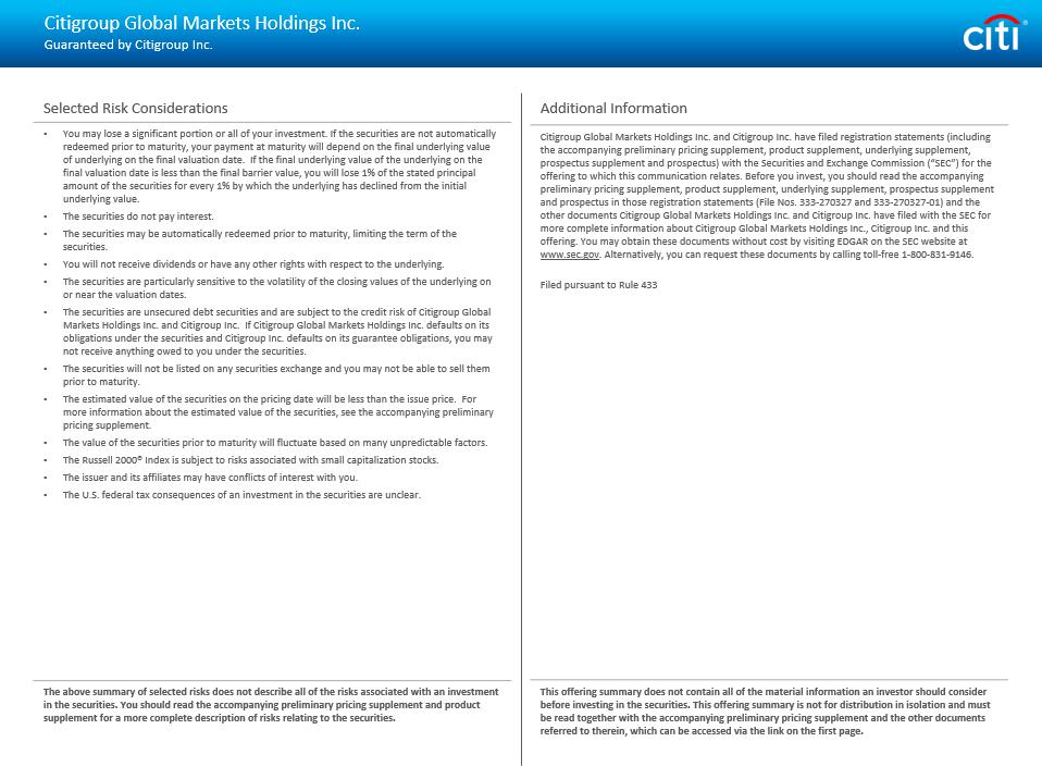 Selected Risk Considerations • You may lose a significant portion or all of your investment. If the securities are not automatically redeemed prior to maturity, your payment at maturity will depend on the final underlying value of underlying on the final valuation date. If the final underlying value of the underlying on the final valuation date is less than the final barrier value, you will lose 1% of the stated principal amount of the securities for every 1% by which the underlying has declined from the initial underlying value. • The securities do not pay interest. • The securities may be automatically redeemed prior to maturity, limiting the term of the securities. • You will not receive dividends or have any other rights with respect to the underlying. • The securities are particularly sensitive to the volatility of the closing values of the underlying on or near the valuation dates. • The securities are unsecured debt securities and are subject to the credit risk of Citigroup Global Markets Holdings Inc. and Citigroup Inc. If Citigroup Global Markets Holdings Inc. defaults on its obligations under the securities and Citigroup Inc. defaults on its guarantee obligations, you may not receive anything owed to you under the securities. • The securities will not be listed on any securities exchange and you may not be able to sell them prior to maturity. • The estimated value of the securities on the pricing date will be less than the issue price. For more information about the estimated value of the securities, see the accompanying preliminary pricing supplement. • The value of the securities prior to maturity will fluctuate based on many unpredictable factors. • The Russell 2000® Index is subject to risks associated with small capitalization stocks. • The issuer and its affiliates may have conflicts of interest with you. • The U.S. federal tax consequences of an investment in the securities are unclear. The above summary of selected risks does not describe all of the risks associated with an investment in the securities. You should read the accompanying preliminary pricing supplement and product supplement for a more complete description of risks relating to the securities. Additional Information Citigroup Global Markets Holdings Inc. and Citigroup Inc. have filed registration statements (including the accompanying preliminary pricing supplement, product supplement, underlying supplement, prospectus supplement and prospectus) with the Securities and Exchange Commission (“SEC”) for the offering to which this communication relates. Before you invest, you should read the accompanying preliminary pricing supplement, product supplement, underlying supplement, prospectus supplement and prospectus in those registration statements (File Nos. 333 - 270327 and 333 - 270327 - 01) and the other documents Citigroup Global Markets Holdings Inc. and Citigroup Inc. have filed with the SEC for more complete information about Citigroup Global Markets Holdings Inc., Citigroup Inc. and this offering. You may obtain these documents without cost by visiting EDGAR on the SEC website at www.sec.gov . Alternatively, you can request these documents by calling toll - free 1 - 800 - 831 - 9146. Filed pursuant to Rule 433 This offering summary does not contain all of the material information an investor should consider before investing in the securities. This offering summary is not for distribution in isolation and must be read together with the accompanying preliminary pricing supplement and the other documents referred to therein, which can be accessed via the link on the first page. Citigroup Global Markets Holdings Inc. Guaranteed by Citigroup Inc.