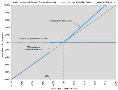 | Automatic Call: | If the basket closing value on the call date is greater than or equal to the starting value, the securities will be automatically called for redemption on the call settlement date for an amount in cash per security equal to $1,000 plus the call premium. |