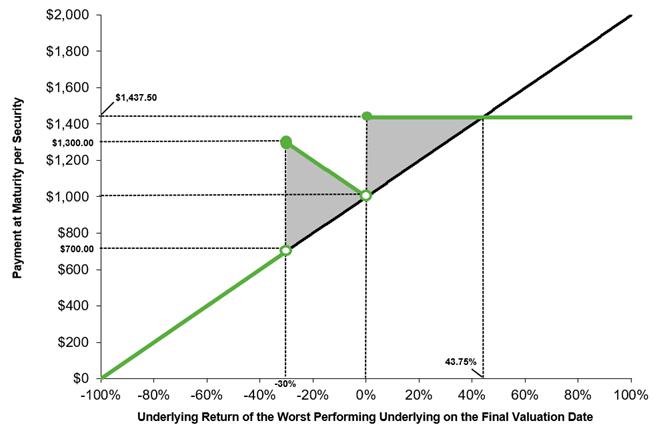 The diagram below illustrates the payment at maturity of the securities, assuming the securities have not previously been automatically redeemed, for a range of hypothetical underlying returns of the worst performing underlying on the final valuation date. Your payment at maturity (if the securities are not earlier automatically redeemed) will be determined based solely on the final underlying value of the worst performing underlying on the final valuation date.