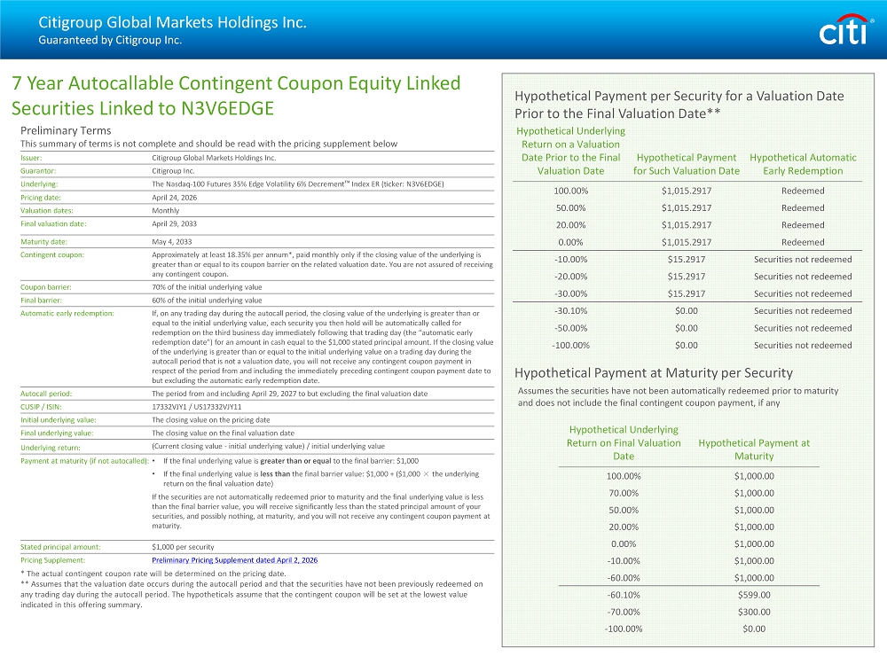 Preliminary Terms This summary of terms is not complete and should be read with the pricing supplement below Citigroup Global Markets Holdings Inc. Issuer: Citigroup Inc. Guarantor: The Nasdaq - 100 Futures 35% Edge Volatility 6% Decrement Index ER (ticker: N3V6EDGE) Underlying: April 24, 2026 Pricing date: Monthly Valuation dates: April 29, 2033 Final valuation date: May 4, 2033 Maturity date: Approximately at least 18.35% per annum*, paid monthly only if the closing value of the underlying is greater than or equal to its coupon barrier on the related valuation date. You are not assured of receiving any contingent coupon. Contingent coupon: 70% of the initial underlying value Coupon barrier: 60% of the initial underlying value Final barrier: If, on any trading day during the autocall period, the closing value of the underlying is greater than or equal to the initial underlying value, each security you then hold will be automatically called for redemption on the third business day immediately following that trading day (the “automatic early redemption date”) for an amount in cash equal to the $1,000 stated principal amount. If the closing value of the underlying is greater than or equal to the initial underlying value on a trading day during the autocall period that is not a valuation date, you will not receive any contingent coupon payment in respect of the period from and including the immediately preceding contingent coupon payment date to but excluding the automatic early redemption date. Automatic early redemption: The period from and including April 29, 2027 to but excluding the final valuation date Autocall period: 17332VJY1 / US17332VJY11 CUSIP / ISIN: The closing value on the pricing date Initial underlying value: The closing value on the final valuation date Final underlying value: (Current closing value - initial underlying value) / initial underlying value Underlying return: • If the final underlying value is greater than or equal to the final barrier: $1,000 • If the final underlying value is less than the final barrier value: $1,000 + ($1,000 × the underlying return on the final valuation date) If the securities are not automatically redeemed prior to maturity and the final underlying value is less than the final barrier value, you will receive significantly less than the stated principal amount of your securities, and possibly nothing, at maturity, and you will not receive any contingent coupon payment at maturity. Payment at maturity (if not autocalled): $1,000 per security Stated principal amount: Preliminary Pricing Supplement dated April 2, 2026 Pricing Supplement: * The actual contingent coupon rate will be determined on the pricing date. ** A ssumes that the valuation date occurs during the autocall period and that the securities have not been previously redeemed on any trading day during the autocall period. The hypotheticals assume that the contingent coupon will be set at the lowest value indicated in this offering summary. Citigroup Global Markets Holdings Inc. Guaranteed by Citigroup Inc. 7 Year Autocallable Contingent Coupon Equity Linked Securities Linked to N3V6EDGE Hypothetical Payment per Security for a Valuation Date Prior to the Final Valuation Date** Hypothetical Payment at Maturity Hypothetical Underlying Return on Final Valuation Date $1,000.00 100.00% $1,000.00 70.00% $1,000.00 50.00% $1,000.00 20.00% $1,000.00 0.00% $1,000.00 - 10.00% $1,000.00 - 60.00% $599.00 - 60.10% $300.00 - 70.00% $0.00 - 100.00% Assumes the securities have not been automatically redeemed prior to maturity and does not include the final contingent coupon payment, if any Hypothetical Automatic Early Redemption Hypothetical Payment for Such Valuation Date Hypothetical Underlying Return on a Valuation Date Prior to the Final Valuation Date Redeemed $1,015.2917 100.00% Redeemed $1,015.2917 50.00% Redeemed $1,015.2917 20.00% Redeemed $1,015.2917 0.00% Securities not redeemed $15.2917 - 10.00% Securities not redeemed $15.2917 - 20.00% Securities not redeemed $15.2917 - 30.00% Securities not redeemed $0.00 - 30.10% Securities not redeemed $0.00 - 50.00% Securities not redeemed $0.00 - 100.00% Hypothetical Payment at Maturity per Security