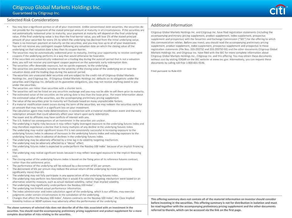 Selected Risk Considerations • You may lose a significant portion or all of your investment. Unlike conventional debt securities, the securities do not provide for the repayment of the stated principal amount at maturity in all circumstances. If the securities are not automatically redeemed prior to maturity, your payment at maturity will depend on the final underlying value. If the final underlying value is less than the final barrier value, you will lose 1% of the stated principal amount of your securities for every 1% by which the underlying has declined from the initial underlying value. There is no minimum payment at maturity on the securities, and you may lose up to all of your investment. • You will not receive any contingent coupon following any valuation date on which the closing value of the underlying on that valuation date is less than its coupon barrier. • The securities may be automatically redeemed prior to maturity, limiting your opportunity to receive contingent coupons if the underlying performs in a way that would otherwise be favorable. • If the securities are automatically redeemed on a trading day during the autocall period that is not a valuation date, you will not receive any contingent coupon payment on the automatic early redemption date. • The securities offer downside exposure, but no upside exposure, to the underlying. • The securities are particularly sensitive to the volatility of the closing value of the underlying on or near the valuation dates and the trading days during the autocall period. • The securities are unsecured debt securities and are subject to the credit risk of Citigroup Global Markets Holdings Inc. and Citigroup Inc. If Citigroup Global Markets Holdings Inc. defaults on its obligations under the securities and Citigroup Inc. defaults on its guarantee obligations, you may not receive anything owed to you under the securities. • The securities are riskier than securities with a shorter term. • The securities will not be listed on any securities exchange and you may not be able to sell them prior to maturity. • The estimated value of the securities on the pricing date is less than the issue price. For more information about the estimated value of the securities, see the accompanying preliminary pricing supplement. • The value of the securities prior to maturity will fluctuate based on many unpredictable factors. • If a material modification event occurs during the term of the securities, we may redeem the securities early for an amount that may result in a significant loss on your investment. • The calculation agent may make determinations in connection with a material modification event and the early redemption amount that could adversely affect your return upon early redemption. • The issuer and its affiliates may have conflicts of interest with you. • The U.S. federal tax consequences of an investment in the securities are unclear. • The underlying is highly risky because it may reflect highly leveraged exposure to the underlying futures index and may therefore experience a decline that is many multiples of any decline in the underlying futures index. • The underlying may realize significant losses if it is not consistently successful in increasing exposure to the underlying futures index in advance of increases in the underlying futures index and reducing exposure to the underlying futures index in advance of declines in the underlying futures index. • The underlying may be adversely affected by a time lag in its volatility targeting mechanism. • The underlying may be adversely affected by a “decay” effect. • The underlying futures index is expected to underperform the Nasdaq - 100 Index ® because of an implicit financing cost. • The underlying may realize significant losses because it may reflect leveraged exposure to the implicit financing cost. • The closing value of the underlying futures index is based on the fixing price of its reference futures contract, rather than the settlement price. • The performance of the underlying will be reduced by a decrement of 6% per annum. • The decrement of 6% per annum may reduce the annual return of the underlying by more (and possibly significantly more) than 6%. • The underlying may not fully participate in any appreciation of the underlying futures index. • The underlying may perform less favorably than it would if its volatility targeting mechanism were based on an alternative volatility measure, such as actual realized volatility, rather than implied volatility. • The underlying may significantly underperform the Nasdaq - 100 Index ® . • The underlying has limited actual performance information. • The index administrator and index calculation agent of the underlying, which is our affiliate, may exercise judgments under certain circumstances in the calculation of the underlying. • Changes that affect the Nasdaq - 100 Index ® , futures contracts on the Nasdaq - 100 Index ® , the Cboe Implied Volatility Indices or NDXP options may adversely affect the performance of the underlying. The above summary of selected risks does not describe all of the risks associated with an investment in the securities. You should read the accompanying preliminary pricing supplement and product supplement for a more complete description of risks relating to the securities. Additional Information Citigroup Global Markets Holdings Inc. and Citigroup Inc. have filed registration statements (including the accompanying preliminary pricing supplement, product supplement, index supplement, prospectus supplement and prospectus) with the Securities and Exchange Commission (“SEC”) for the offering to which this communication relates. Before you invest, you should read the accompanying preliminary pricing supplement, product supplement, index supplement, prospectus supplement and prospectus in those registration statements (File Nos . 333 - 293732 and 333 -