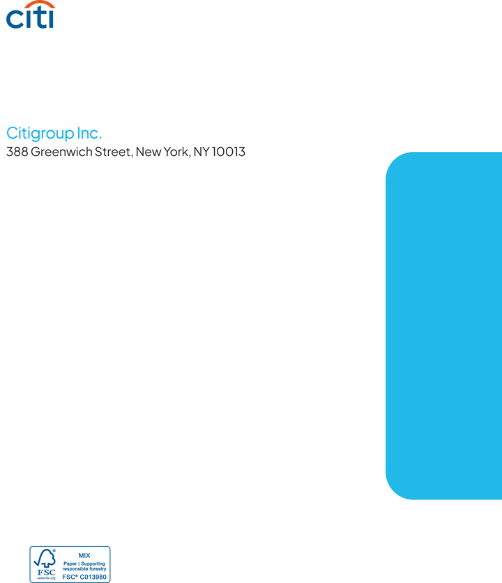 Certain statements in this Proxy Statement are “forward-looking statements” within the meaning of the Private Securities Litigation Reform Act of 1995. Forward-looking statements are not based on historical facts but instead represent Citi’s and its management’s beliefs regarding future events. Such statements are based on management’s current expectations and are subject to risks, uncertainties and changes in circumstances. These statements are not guarantees of future results or occurrences. Actual results, performance or outcomes may differ materially from those expressed in or implied by any of these forward-looking statements due to a variety of factors, including, among others, various challenges related to Citi’s transformation, including significant execution and regulatory complexities and uncertainties, macroeconomic and geopolitical challenges and uncertainties, energy prices, diverging regulatory and policy changes and uncertainties, our ability to gather and verify data, and technological innovations and challenges, including the ability of our partners or potential partners as well as their suppliers to successfully produce or scale new technologies under expected time frames. Other factors that could cause actual results, performance, outcomes or financial condition to differ materially from those described in forward-looking statements can be found in this report and in Citi’s filings with the SEC, including without limitation the “Risk Factors” section of Citi’s 2025 Annual Report on Form 10-K (2025 Annual Report on Form 10-K) filed with the SEC on February 20, 2026. Any forward-looking statements made by or on behalf of Citi speak only as to the date they are made, and Citi does not undertake to update forward-looking statements to reflect the impact of circumstances or events that arise after the date that the forward-looking statements were made. Website references are provided for convenience only, and the information contained on such websites is not incorporated into nor does it constitute a part of this Proxy Statement.
