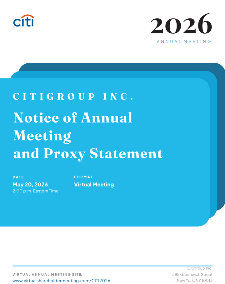 Citi has utilized the Securities and Exchange Commission (SEC) rule allowing companies to furnish proxy materials to their stockholders over the Internet. This process allows us to expedite our stockholders’ receipt of proxy materials, lower the costs of distribution, and reduce the environmental impact of our 2026 Annual Meeting.