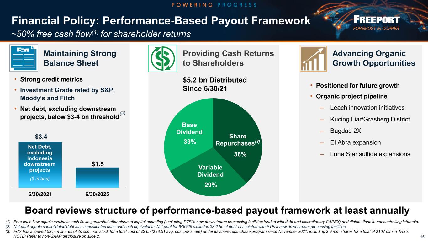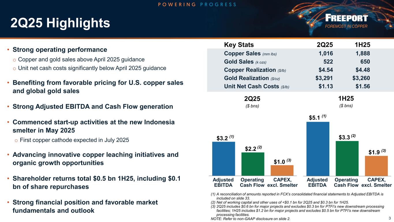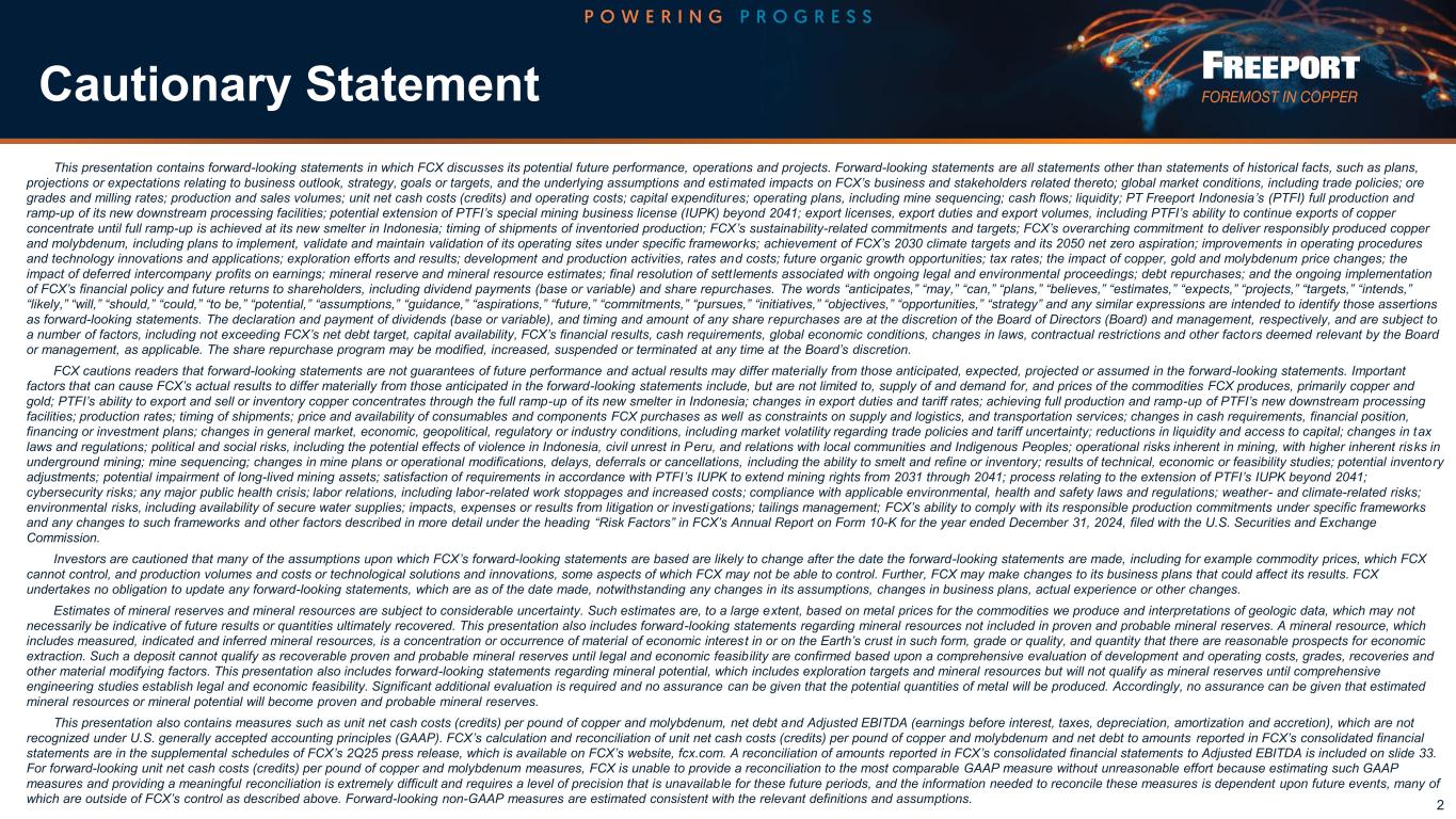 Cautionary Statement This presentation contains forward-looking statements in which FCX discusses its potential future performance, operations and projects. Forward-looking statements are all statements other than statements of historical facts, such as plans, projections or expectations relating to business outlook, strategy, goals or targets, and the underlying assumptions and estimated impacts on FCX’s business and stakeholders related thereto; global market conditions, including trade policies; ore grades and milling rates; production and sales volumes; unit net cash costs (credits) and operating costs; capital expenditures; operating plans, including mine sequencing; cash flows; liquidity; PT Freeport Indonesia’s (PTFI) full production and ramp-up of its new downstream processing facilities; potential extension of PTFI’s special mining business license (IUPK) beyond 2041; export licenses, export duties and export volumes, including PTFI’s ability to continue exports of copper concentrate until full ramp-up is achieved at its new smelter in Indonesia; timing of shipments of inventoried production; FCX’s sustainability-related commitments and targets; FCX’s overarching commitment to deliver responsibly produced copper and molybdenum, including plans to implement, validate and maintain validation of its operating sites under specific frameworks; achievement of FCX’s 2030 climate targets and its 2050 net zero aspiration; improvements in operating procedures and technology innovations and applications; exploration efforts and results; development and production activities, rates and costs; future organic growth opportunities; tax rates; the impact of copper, gold and molybdenum price changes; the impact of deferred intercompany profits on earnings; mineral reserve and mineral resource estimates; final resolution of sett lements associated with ongoing legal and environmental proceedings; debt repurchases; and the ongoing implementation of FCX’s financial policy and future returns to shareholders, including dividend payments (base or variable) and share repurchases. The words “anticipates,” “may,” “can,” “plans,” “believes,” “estimates,” “expects,” “projects,” “targets,” “intends,” “likely,” “will,” “should,” “could,” “to be,” “potential,” “assumptions,” “guidance,” “aspirations,” “future,” “commitments,” “pursues,” “initiatives,” “objectives,” “opportunities,” “strategy” and any similar expressions are intended to identify those assertions as forward-looking statements. The declaration and payment of dividends (base or variable), and timing and amount of any share repurchases are at the discretion of the Board of Directors (Board) and management, respectively, and are subject to a number of factors, including not exceeding FCX’s net debt target, capital availability, FCX’s financial results, cash requirements, global economic conditions, changes in laws, contractual restrictions and other factors deemed relevant by the Board or management, as applicable. The share repurchase program may be modified, increased, suspended or terminated at any time at the Board’s discretion. FCX cautions readers that forward-looking statements are not guarantees of future performance and actual results may differ materially from those anticipated, expected, projected or assumed in the forward-looking statements. Important factors that can cause FCX’s actual results to differ materially from those anticipated in the forward-looking statements include, but are not limited to, supply of and demand for, and prices of the commodities FCX produces, primarily copper and gold; PTFI’s ability to export and sell or inventory copper concentrates through the full ramp-up of its new smelter in Indonesia; changes in export duties and tariff rates; achieving full production and ramp-up of PTFI’s new downstream processing facilities; production rates; timing of shipments; price and availability of consumables and components FCX purchases as well as constraints on supply and logistics, and transportation services; changes in cash requirements, financial position, financing or investment plans; changes in general market, economic, geopolitical, regulatory or industry conditions, including market volatility regarding trade policies and tariff uncertainty; reductions in liquidity and access to capital; changes in tax laws and regulations; political and social risks, including the potential effects of violence in Indonesia, civil unrest in Peru, and relations with local communities and Indigenous Peoples; operational risks inherent in mining, with higher inherent risks in underground mining; mine sequencing; changes in mine plans or operational modifications, delays, deferrals or cancellations, including the ability to smelt and refine or inventory; results of technical, economic or feasibility studies; potential inventory adjustments; potential impairment of long-lived mining assets; satisfaction of requirements in accordance with PTFI’s IUPK to extend mining rights from 2031 through 2041; process relating to the extension of PTFI’s IUPK beyond 2041; cybersecurity risks; any major public health crisis; labor relations, including labor-related work stoppages and increased costs; compliance with applicable environmental, health and safety laws and regulations; weather- and climate-related risks; environmental risks, including availability of secure water supplies; impacts, expenses or results from litigation or investigations; tailings management; FCX’s ability to comply with its responsible production commitments under specific frameworks and any changes to such frameworks and other factors described in more detail under the heading “Risk Factors” in FCX’s Annual Report on Form 10-K for the year ended December 31, 2024, filed with the U.S. Securities and Exchange Commission. Investors a