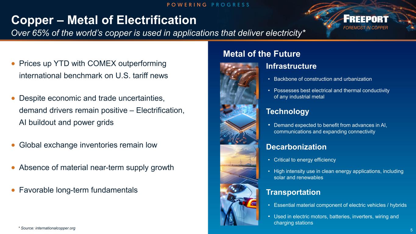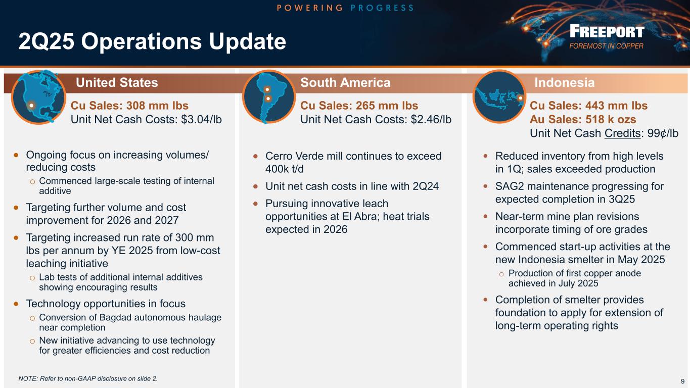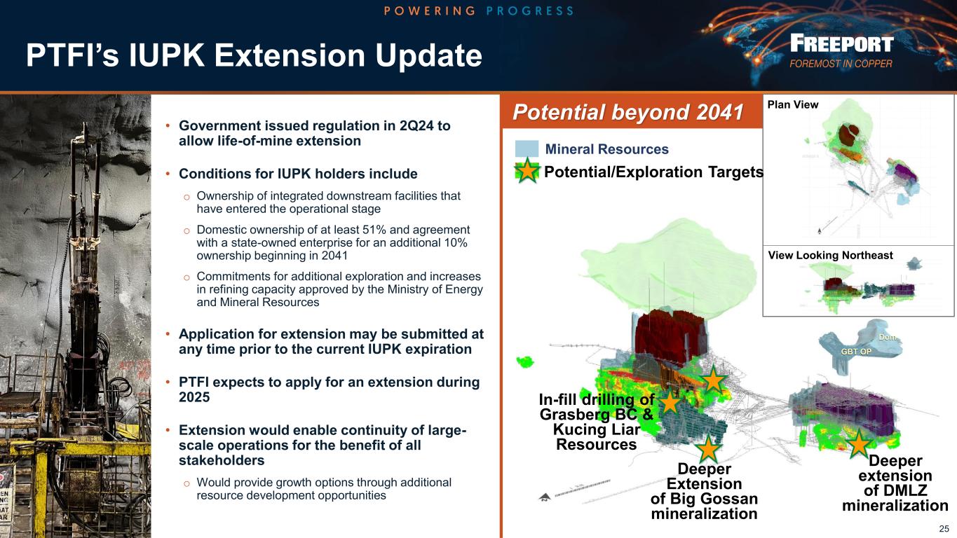 Cautionary Statement This presentation contains forward-looking statements in which FCX discusses its potential future performance, operations and projects. Forward-looking statements are all statements other than statements of historical facts, such as plans, projections or expectations relating to business outlook, strategy, goals or targets, and the underlying assumptions and estimated impacts on FCX’s business and stakeholders related thereto; global market conditions, including trade policies; ore grades and milling rates; production and sales volumes; unit net cash costs (credits) and operating costs; capital expenditures; operating plans, including mine sequencing; cash flows; liquidity; PT Freeport Indonesia’s (PTFI) full production and ramp-up of its new downstream processing facilities; potential extension of PTFI’s special mining business license (IUPK) beyond 2041; export licenses, export duties and export volumes, including PTFI’s ability to continue exports of copper concentrate until full ramp-up is achieved at its new smelter in Indonesia; timing of shipments of inventoried production; FCX’s sustainability-related commitments and targets; FCX’s overarching commitment to deliver responsibly produced copper and molybdenum, including plans to implement, validate and maintain validation of its operating sites under specific frameworks; achievement of FCX’s 2030 climate targets and its 2050 net zero aspiration; improvements in operating procedures and technology innovations and applications; exploration efforts and results; development and production activities, rates and costs; future organic growth opportunities; tax rates; the impact of copper, gold and molybdenum price changes; the impact of deferred intercompany profits on earnings; mineral reserve and mineral resource estimates; final resolution of sett lements associated with ongoing legal and environmental proceedings; debt repurchases; and the ongoing implementation of FCX’s financial policy and future returns to shareholders, including dividend payments (base or variable) and share repurchases. The words “anticipates,” “may,” “can,” “plans,” “believes,” “estimates,” “expects,” “projects,” “targets,” “intends,” “likely,” “will,” “should,” “could,” “to be,” “potential,” “assumptions,” “guidance,” “aspirations,” “future,” “commitments,” “pursues,” “initiatives,” “objectives,” “opportunities,” “strategy” and any similar expressions are intended to identify those assertions as forward-looking statements. The declaration and payment of dividends (base or variable), and timing and amount of any share repurchases are at the discretion of the Board of Directors (Board) and management, respectively, and are subject to a number of factors, including not exceeding FCX’s net debt target, capital availability, FCX’s financial results, cash requirements, global economic conditions, changes in laws, contractual restrictions and other factors deemed relevant by the Board or management, as applicable. The share repurchase program may be modified, increased, suspended or terminated at any time at the Board’s discretion. FCX cautions readers that forward-looking statements are not guarantees of future performance and actual results may differ materially from those anticipated, expected, projected or assumed in the forward-looking statements. Important factors that can cause FCX’s actual results to differ materially from those anticipated in the forward-looking statements include, but are not limited to, supply of and demand for, and prices of the commodities FCX produces, primarily copper and gold; PTFI’s ability to export and sell or inventory copper concentrates through the full ramp-up of its new smelter in Indonesia; changes in export duties and tariff rates; achieving full production and ramp-up of PTFI’s new downstream processing facilities; production rates; timing of shipments; price and availability of consumables and components FCX purchases as well as constraints on supply and logistics, and transportation services; changes in cash requirements, financial position, financing or investment plans; changes in general market, economic, geopolitical, regulatory or industry conditions, including market volatility regarding trade policies and tariff uncertainty; reductions in liquidity and access to capital; changes in tax laws and regulations; political and social risks, including the potential effects of violence in Indonesia, civil unrest in Peru, and relations with local communities and Indigenous Peoples; operational risks inherent in mining, with higher inherent risks in underground mining; mine sequencing; changes in mine plans or operational modifications, delays, deferrals or cancellations, including the ability to smelt and refine or inventory; results of technical, economic or feasibility studies; potential inventory adjustments; potential impairment of long-lived mining assets; satisfaction of requirements in accordance with PTFI’s IUPK to extend mining rights from 2031 through 2041; process relating to the extension of PTFI’s IUPK beyond 2041; cybersecurity risks; any major public health crisis; labor relations, including labor-related work stoppages and increased costs; compliance with applicable environmental, health and safety laws and regulations; weather- and climate-related risks; environmental risks, including availability of secure water supplies; impacts, expenses or results from litigation or investigations; tailings management; FCX’s ability to comply with its responsible production commitments under specific frameworks and any changes to such frameworks and other factors described in more detail under the heading “Risk Factors” in FCX’s Annual Report on Form 10-K for the year ended December 31, 2024, filed with the U.S. Securities and Exchange Commission. Investors a