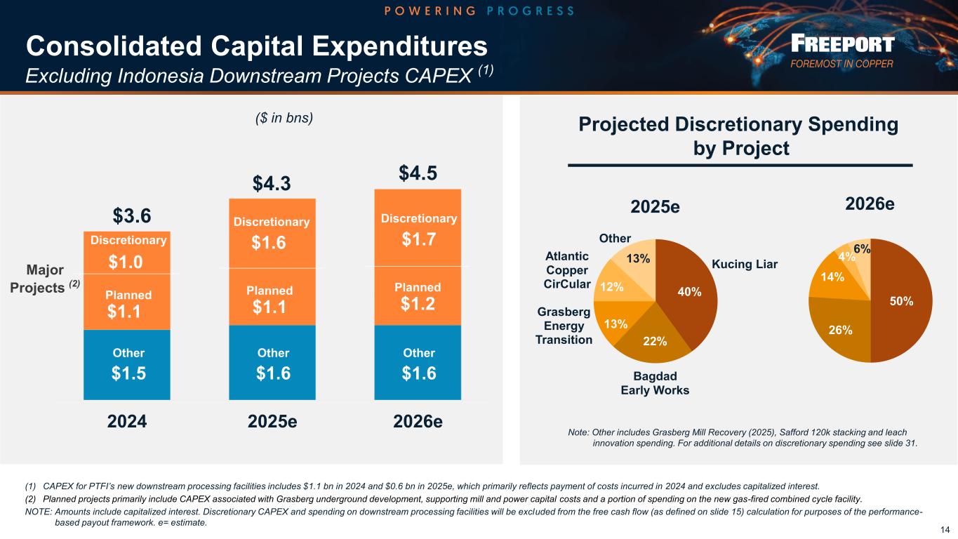 $0 $4 $8 $12 $16 $20 Cu $4.00/lb Cu $4.50/lb Cu $5.00/lb Average ’26e/’27e EBITDA and Cash Flow at Various Copper Prices Assuming $3,300/oz gold, $22/lb molybdenum 13 NOTE: Refer to non-GAAP disclosure on slide 2. e = estimate. (1) U.S. Dollar Exchange Rates: 938 Chilean peso, 16,000 Indonesian rupiah, $0.65 Australian dollar, $1.15 euro, 3.62 Peruvian sol base case assumption. Each +10% equals a 10% strengthening of the U.S. dollar; a strengthening of the U.S. dollar against forecasted expenditures in these foreign currencies equates to a cost benefit of noted amounts. ($ in bns except copper, gold and molybdenum prices) Operating Cash Flow Excludes working capital changes EBITDA Sensitivities Average ’26e/’27e (US$ in mms) EBITDA Operating Cash Flow Copper +/-$0.10/lb $330 COMEX Premium to LME +/-$0.10/lb $135 Molybdenum +/-$1.00/lb $ 85 Gold +/-$100/oz $100 Currencies (1) +/-10% $165 Diesel +/-10% $ 50 Copper +/-$0.10/lb $425 COMEX Premium to LME +/-$0.10/lb $135 Molybdenum +/-$1.00/lb $ 90 Gold +/-$100/oz $150 Currencies (1) +/-10% $235 Diesel +/-10% $ 75 25% COMEX Premium 50% COMEX Premium 25% COMEX Premium 50% COMEX Premium $0 $4 $8 $12 $16 $20 Cu $4.00/lb Cu $4.50/lb Cu $5.00/lb Average ’26e/’27e