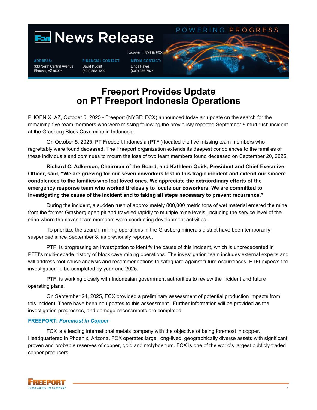 1 Freeport Provides Update on PT Freeport Indonesia Operations PHOENIX, AZ, October 5, 2025 - Freeport (NYSE: FCX) announced today an update on the search for the remaining five team members who were missing following the previously reported September 8 mud rush incident at the Grasberg Block Cave mine in Indonesia. On October 5, 2025, PT Freeport Indonesia (PTFI) located the five missing team members who regrettably were found deceased. The Freeport organization extends its deepest condolences to the families of these individuals and continues to mourn the loss of two team members found deceased on September 20, 2025. Richard C. Adkerson, Chairman of the Board, and Kathleen Quirk, President and Chief Executive Officer, said, “We are grieving for our seven coworkers lost in this tragic incident and extend our sincere condolences to the families who lost loved ones. We appreciate the extraordinary efforts of the emergency response team who worked tirelessly to locate our coworkers. We are committed to investigating the cause of the incident and to taking all steps necessary to prevent recurrence.” During the incident, a sudden rush of approximately 800,000 metric tons of wet material entered the mine from the former Grasberg open pit and traveled rapidly to multiple mine levels, including the service level of the mine where the seven team members were conducting development activities. To prioritize the search, mining operations in the Grasberg minerals district have been temporarily suspended since September 8, as previously reported. PTFI is progressing an investigation to identify the cause of this incident, which is unprecedented in PTFI’s multi-decade history of block cave mining operations. The investigation team includes external experts and will address root cause analysis and recommendations to safeguard against future occurrences. PTFI expects the investigation to be completed by year-end 2025. PTFI is working closely with Indonesian government authorities to review the incident and future operating plans. On September 24, 2025, FCX provided a preliminary assessment of potential production impacts from this incident. There have been no updates to this assessment. Further information will be provided as the investigation progresses, and damage assessments are completed. FREEPORT: Foremost in Copper FCX is a leading international metals company with the objective of being foremost in copper. Headquartered in Phoenix, Arizona, FCX operates large, long-lived, geographically diverse assets with significant proven and probable reserves of copper, gold and molybdenum. FCX is one of the world’s largest publicly traded copper producers.