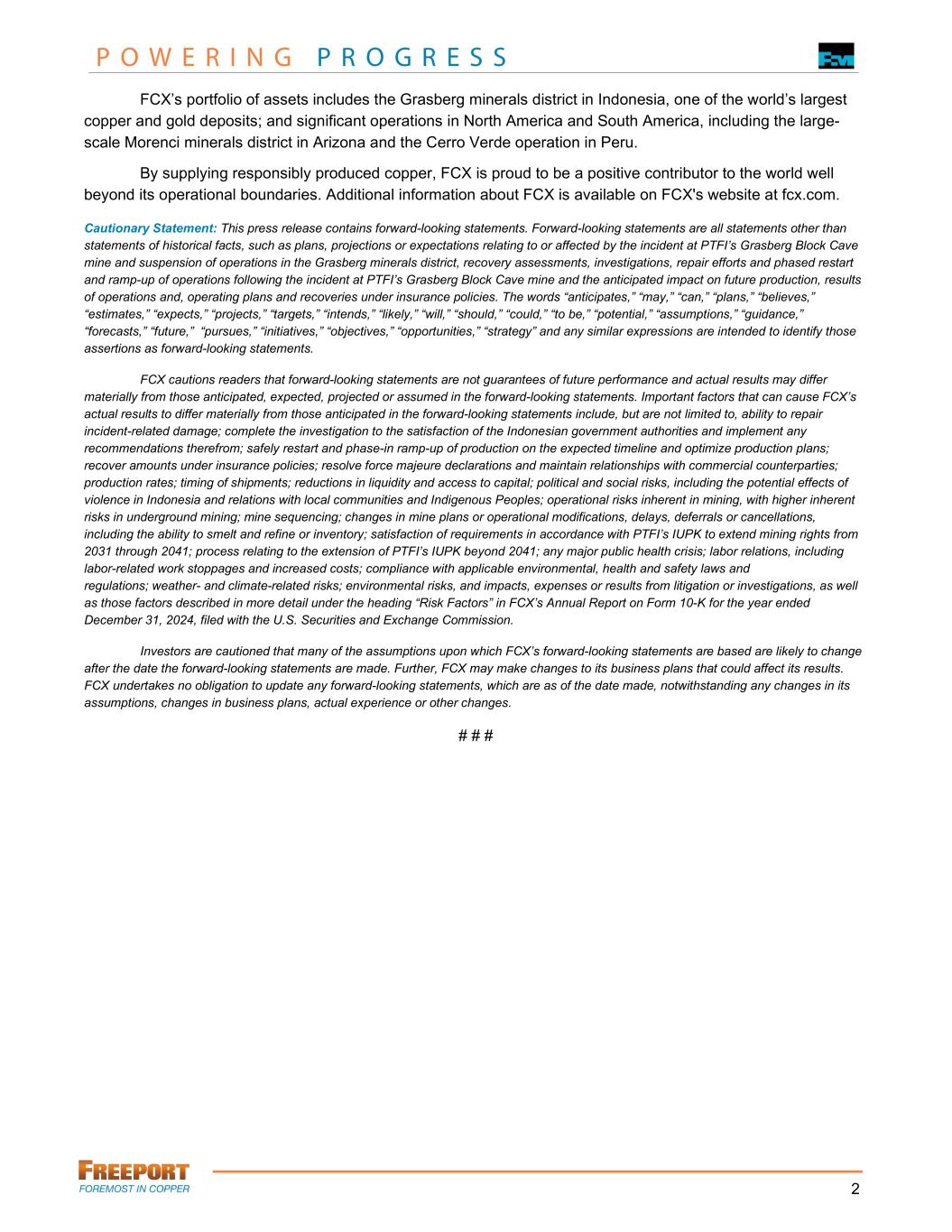 {N4163160.1} 2 FCX’s portfolio of assets includes the Grasberg minerals district in Indonesia, one of the world’s largest copper and gold deposits; and significant operations in North America and South America, including the large- scale Morenci minerals district in Arizona and the Cerro Verde operation in Peru. By supplying responsibly produced copper, FCX is proud to be a positive contributor to the world well beyond its operational boundaries. Additional information about FCX is available on FCX's website at fcx.com. Cautionary Statement: This press release contains forward-looking statements. Forward-looking statements are all statements other than statements of historical facts, such as plans, projections or expectations relating to or affected by the incident at PTFI’s Grasberg Block Cave mine and suspension of operations in the Grasberg minerals district, recovery assessments, investigations, repair efforts and phased restart and ramp-up of operations following the incident at PTFI’s Grasberg Block Cave mine and the anticipated impact on future production, results of operations and, operating plans and recoveries under insurance policies. The words “anticipates,” “may,” “can,” “plans,” “believes,” “estimates,” “expects,” “projects,” “targets,” “intends,” “likely,” “will,” “should,” “could,” “to be,” “potential,” “assumptions,” “guidance,” “forecasts,” “future,” “pursues,” “initiatives,” “objectives,” “opportunities,” “strategy” and any similar expressions are intended to identify those assertions as forward-looking statements. FCX cautions readers that forward-looking statements are not guarantees of future performance and actual results may differ materially from those anticipated, expected, projected or assumed in the forward-looking statements. Important factors that can cause FCX’s actual results to differ materially from those anticipated in the forward-looking statements include, but are not limited to, ability to repair incident-related damage; complete the investigation to the satisfaction of the Indonesian government authorities and implement any recommendations therefrom; safely restart and phase-in ramp-up of production on the expected timeline and optimize production plans; recover amounts under insurance policies; resolve force majeure declarations and maintain relationships with commercial counterparties; production rates; timing of shipments; reductions in liquidity and access to capital; political and social risks, including the potential effects of violence in Indonesia and relations with local communities and Indigenous Peoples; operational risks inherent in mining, with higher inherent risks in underground mining; mine sequencing; changes in mine plans or operational modifications, delays, deferrals or cancellations, including the ability to smelt and refine or inventory; satisfaction of requirements in accordance with PTFI’s IUPK to extend mining rights from 2031 through 2041; process relating to the extension of PTFI’s IUPK beyond 2041; any major public health crisis; labor relations, including labor-related work stoppages and increased costs; compliance with applicable environmental, health and safety laws and regulations; weather- and climate-related risks; environmental risks, and impacts, expenses or results from litigation or investigations, as well as those factors described in more detail under the heading “Risk Factors” in FCX’s Annual Report on Form 10-K for the year ended December 31, 2024, filed with the U.S. Securities and Exchange Commission. Investors are cautioned that many of the assumptions upon which FCX’s forward-looking statements are based are likely to change after the date the forward-looking statements are made. Further, FCX may make changes to its business plans that could affect its results. FCX undertakes no obligation to update any forward-looking statements, which are as of the date made, notwithstanding any changes in its assumptions, changes in business plans, actual experience or other changes. # # #