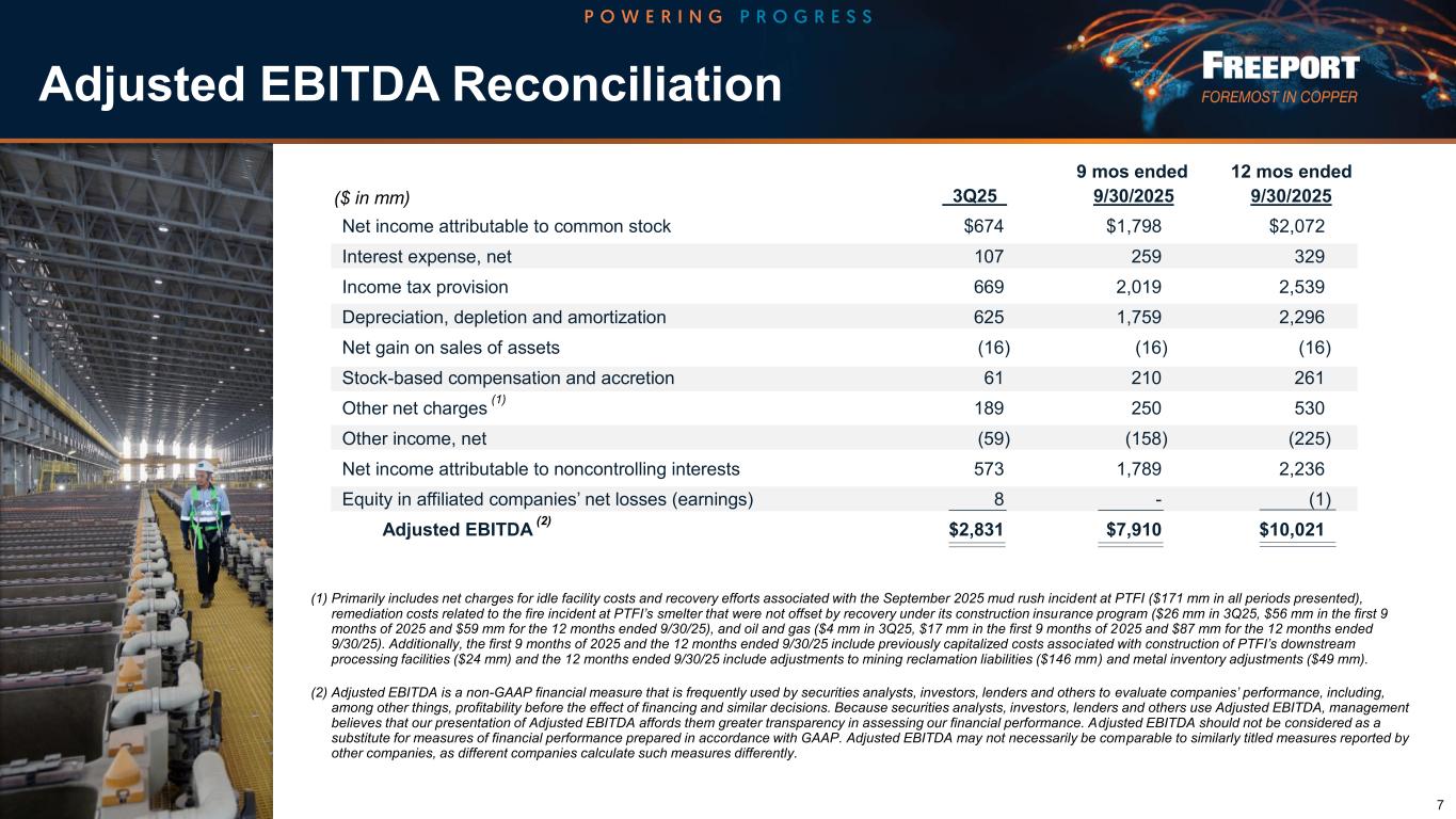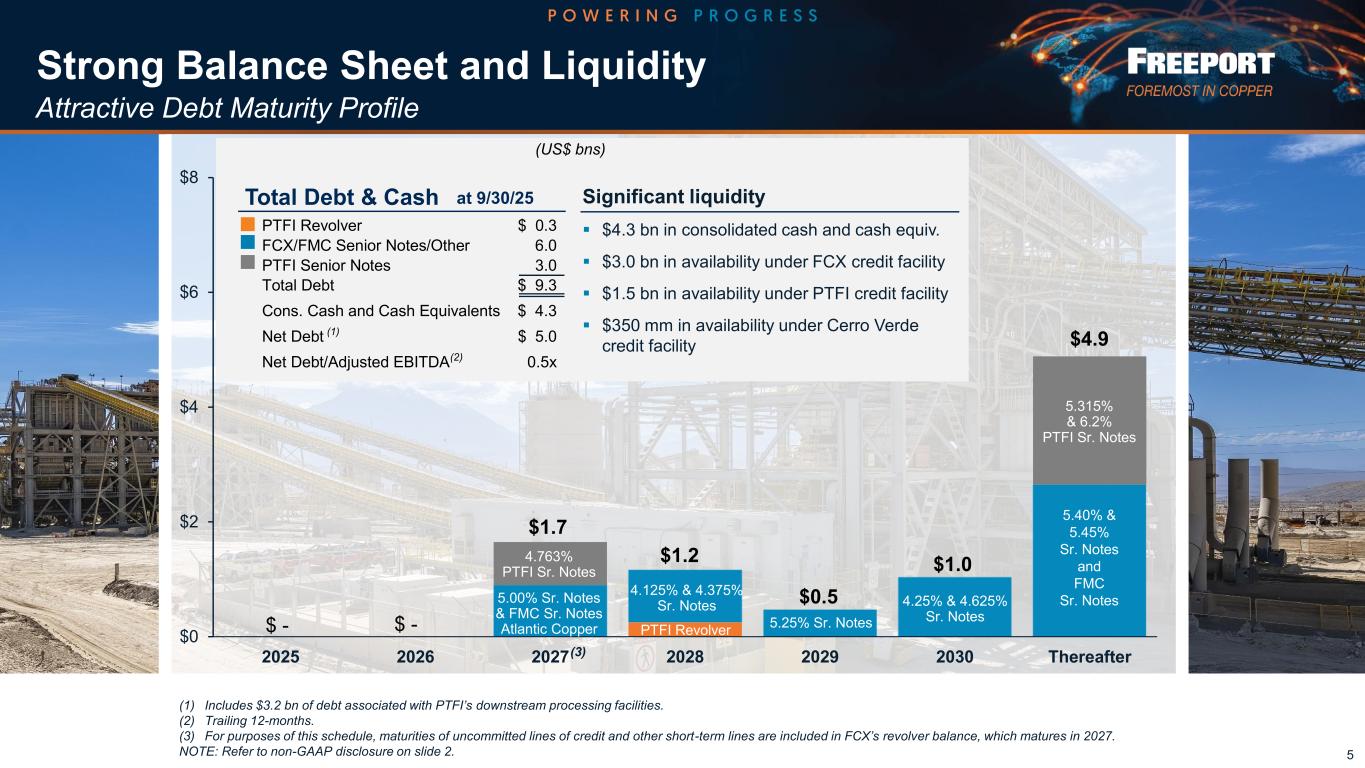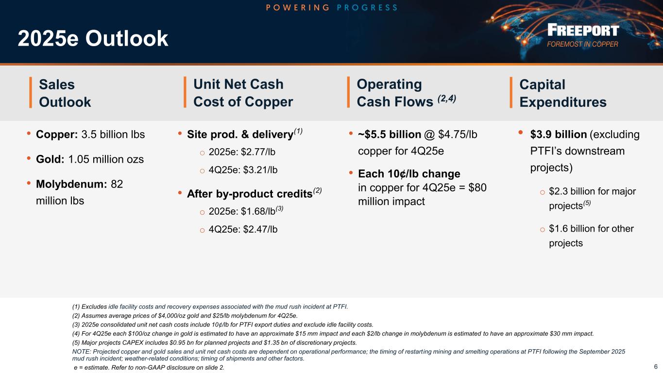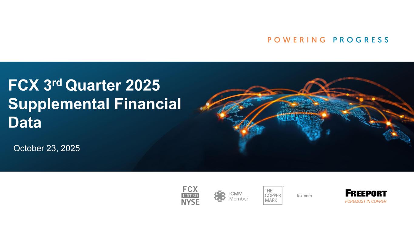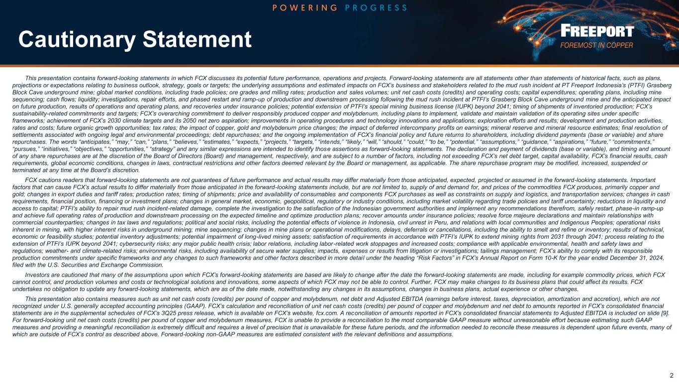 Cautionary Statement This presentation contains forward-looking statements in which FCX discusses its potential future performance, operations and projects. Forward-looking statements are all statements other than statements of historical facts, such as plans, projections or expectations relating to business outlook, strategy, goals or targets; the underlying assumptions and estimated impacts on FCX’s business and stakeholders related to the mud rush incident at PT Freeport Indonesia’s (PTFI) Grasberg Block Cave underground mine; global market conditions, including trade policies; ore grades and milling rates; production and sales volumes; unit net cash costs (credits) and operating costs; capital expenditures; operating plans, including mine sequencing; cash flows; liquidity; investigations, repair efforts, and phased restart and ramp-up of production and downstream processing following the mud rush incident at PTFI’s Grasberg Block Cave underground mine and the anticipated impact on future production, results of operations and operating plans, and recoveries under insurance policies; potential extension of PTFI’s special mining business license (IUPK) beyond 2041; timing of shipments of inventoried production; FCX’s sustainability-related commitments and targets; FCX’s overarching commitment to deliver responsibly produced copper and molybdenum, including plans to implement, validate and maintain validation of its operating sites under specific frameworks; achievement of FCX’s 2030 climate targets and its 2050 net zero aspiration; improvements in operating procedures and technology innovations and applications; exploration efforts and results; development and production activities, rates and costs; future organic growth opportunities; tax rates; the impact of copper, gold and molybdenum price changes; the impact of deferred intercompany profits on earnings; mineral reserve and mineral resource estimates; final resolution of settlements associated with ongoing legal and environmental proceedings; debt repurchases; and the ongoing implementation of FCX’s financial policy and future returns to shareholders, including dividend payments (base or variable) and share repurchases. The words “anticipates,” “may,” “can,” “plans,” “believes,” “estimates,” “expects,” “projects,” “targets,” “intends,” “likely,” “will,” “should,” “could,” “to be,” “potential,” “assumptions,” “guidance,” “aspirations,” “future,” “commitments,” “pursues,” “initiatives,” “objectives,” “opportunities,” “strategy” and any similar expressions are intended to identify those assertions as forward-looking statements. The declaration and payment of dividends (base or variable), and timing and amount of any share repurchases are at the discretion of the Board of Directors (Board) and management, respectively, and are subject to a number of factors, including not exceeding FCX’s net debt target, capital availability, FCX’s financial results, cash requirements, global economic conditions, changes in laws, contractual restrictions and other factors deemed relevant by the Board or management, as applicable. The share repurchase program may be modified, increased, suspended or terminated at any time at the Board’s discretion. FCX cautions readers that forward-looking statements are not guarantees of future performance and actual results may differ materially from those anticipated, expected, projected or assumed in the forward-looking statements. Important factors that can cause FCX’s actual results to differ materially from those anticipated in the forward-looking statements include, but are not limited to, supply of and demand for, and prices of the commodities FCX produces, primarily copper and gold; changes in export duties and tariff rates; production rates; timing of shipments; price and availability of consumables and components FCX purchases as well as constraints on supply and logistics, and transportation services; changes in cash requirements, financial position, financing or investment plans; changes in general market, economic, geopolitical, regulatory or industry conditions, including market volatility regarding trade policies and tariff uncertainty; reductions in liquidity and access to capital; PTFI’s ability to repair mud rush incident-related damage, complete the investigation to the satisfaction of the Indonesian government authorities and implement any recommendations therefrom, safely restart, phase-in ramp-up and achieve full operating rates of production and downstream processing on the expected timeline and optimize production plans; recover amounts under insurance policies; resolve force majeure declarations and maintain relationships with commercial counterparties; changes in tax laws and regulations; political and social risks, including the potential effects of violence in Indonesia, civil unrest in Peru, and relations with local communities and Indigenous Peoples; operational risks inherent in mining, with higher inherent risks in underground mining; mine sequencing; changes in mine plans or operational modifications, delays, deferrals or cancellations, including the ability to smelt and refine or inventory; results of technical, economic or feasibility studies; potential inventory adjustments; potential impairment of long-lived mining assets; satisfaction of requirements in accordance with PTFI’s IUPK to extend mining rights from 2031 through 2041; process relating to the extension of PTFI’s IUPK beyond 2041; cybersecurity risks; any major public health crisis; labor relations, including labor-related work stoppages and increased costs; compliance with applicable environmental, health and safety laws and regulations; weather- and climate-related risks; environmental risks, including availability of secure water supplies; impacts, expenses or results from litigation or in