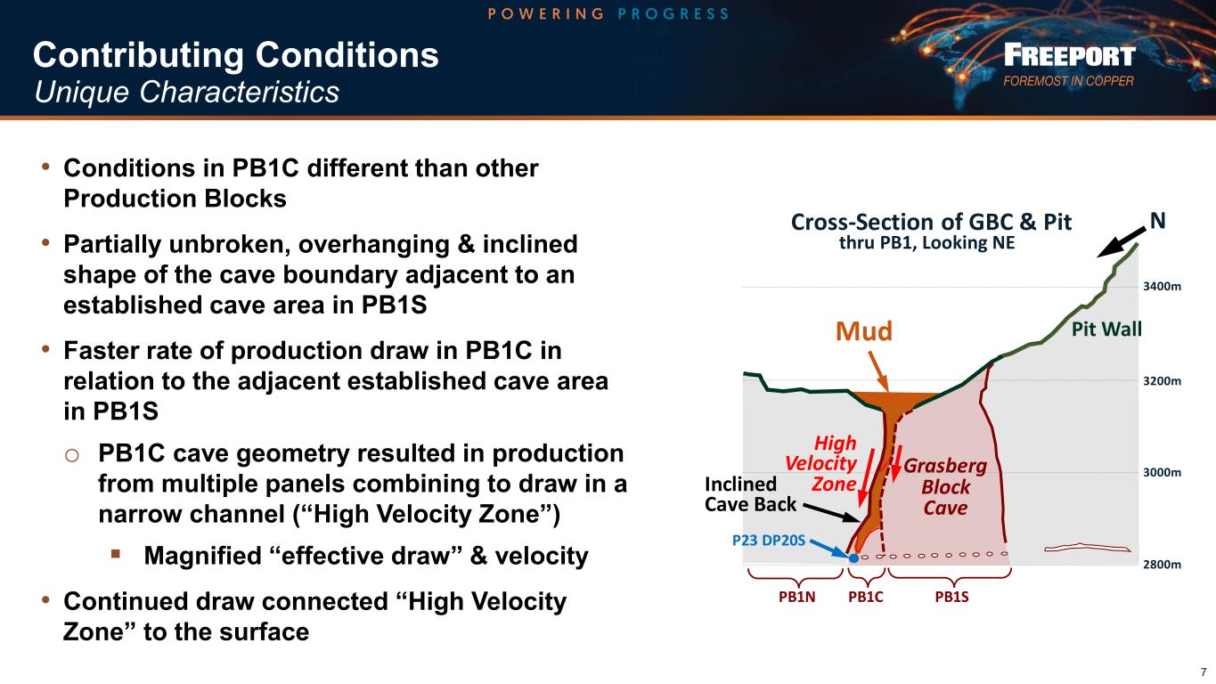 Background on Production Block 1C 6 • PB1C is located approximately 300 meters beneath the low spot of the former Grasberg surface mine • Largely composed of a low strength, clay rich, geological domain termed “Softzone” • PB1C was designed with relatively narrow geometry (three panels wide) as an extension of an established Production Block (PB1S) which commenced production in 2019 • Production in PB1C started in 2022 from two panels with the third panel (Panel 23) commencing production in October 2024 • Incident occurred through the formation of an undetected pathway along the cave boundary connecting a panel in PB1C to mud accumulation at the surface * YTD through August 2025 Statistics PB1C PB1S GBC Drawpoints 70 174 923 PTFI Cu Au Cu Au % of Reserves 2% 3% 4% 6% % of Production* 7% 7% 8% 10% Grasberg Block Cave Plan View Future PBs PB3 PB2N PB2S PB1 PB1N PB1C PB1S P23 P34 N (Panel 23)