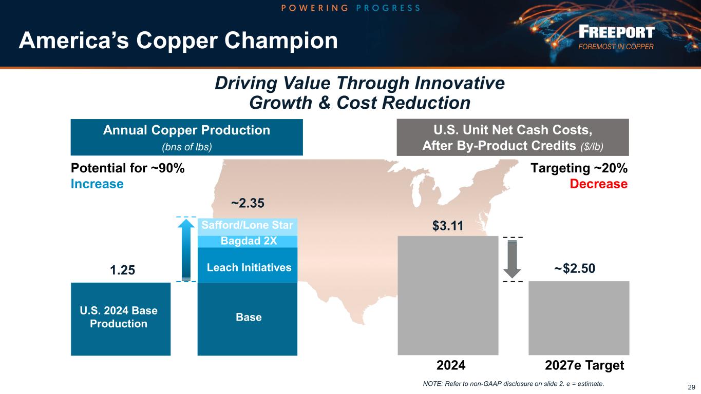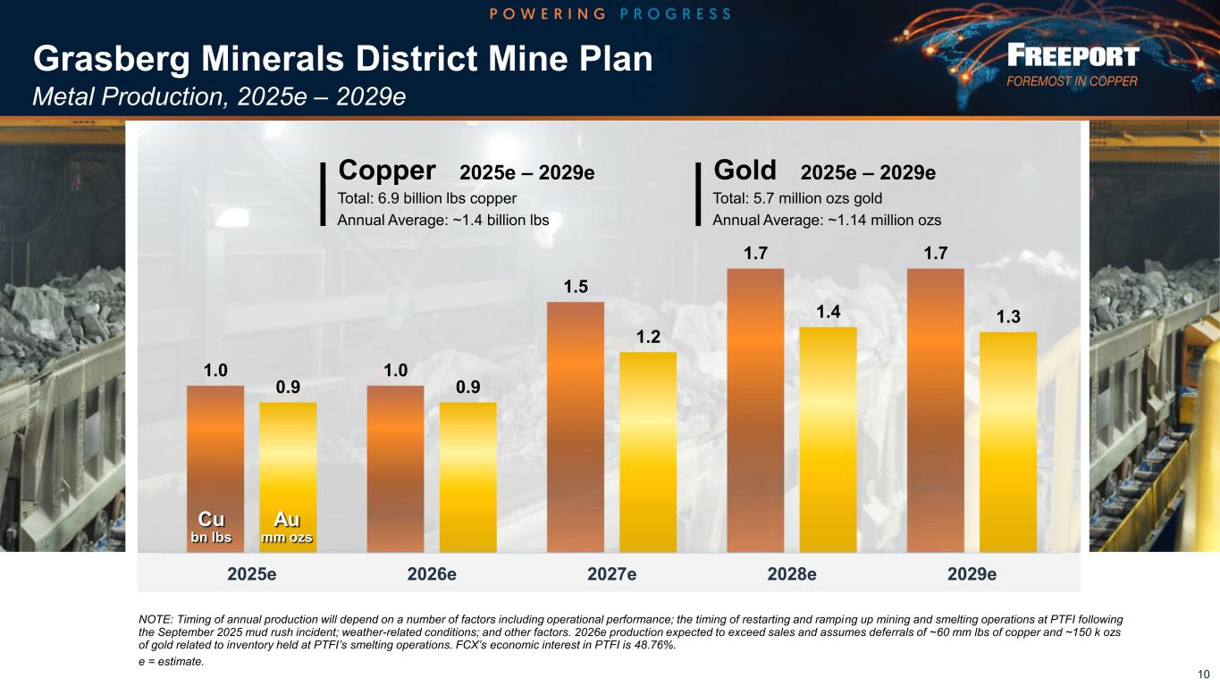 Cautionary Statement This presentation contains forward-looking statements in which FCX discusses its potential future performance, operations and projects. Forward-looking statements are all statements other than statements of historical facts, such as plans, projections or expectations relating to business outlook, strategy, goals or targets; the underlying assumptions and estimated impacts on FCX’s business and stakeholders related to the mud rush incident at PT Freeport Indonesia’s (PTFI) Grasberg Block Cave underground mine; global market conditions, including trade policies; ore grades and milling rates; production and sales volumes; higher variability between PTFI production and sales; unit net cash costs (credits) and operating costs; capital expenditures; operating plans, including mine sequencing; cash flows; liquidity; investigations, remediation efforts and phased restart and ramp-up of production and downstream processing following the mud rush incident at PTFI’s Grasberg Block Cave underground mine and the anticipated impact on future production, sales, results of operations and operating plans, and recoveries under insurance policies; potential extension of PTFI’s special mining business license (IUPK) beyond 2041; timing of shipments of inventoried production; FCX’s sustainability-related commitments and targets; FCX’s overarching commitment to deliver responsibly produced copper and molybdenum, including plans to implement, validate and maintain validation of its operating sites under specific frameworks; achievement of FCX’s 2030 climate targets and its 2050 net zero aspiration; improvements in operating procedures and technology innovations and applications; exploration efforts and results; development and production activities, rates and costs; future organic growth opportunities; tax rates; the impact of copper, gold and molybdenum price changes; the impact of deferred intercompany profits on earnings; mineral reserve and mineral resource estimates; final resolution of settlements associated with ongoing legal and environmental proceedings; debt repurchases; and the ongoing implementation of FCX’s financial policy and future returns to shareholders, including dividend payments (base or variable) and share repurchases. The words “anticipates,” “may,” “can,” “plans,” “believes,” “estimates,” “expects,” “projects,” “targets,” “intends,” “likely,” “will,” “should,” “could,” “to be,” “potential,” “assumptions,” “guidance,” “aspirations,” “future,” “commitments,” “pursues,” “initiatives,” “objectives,” “opportunities,” “strategy” and any similar expressions are intended to identify those assertions as forward-looking statements. The declaration and payment of dividends (base or variable), and timing and amount of any share repurchases are at the discretion of the Board of Directors (Board) and management, respectively, and are subject to a number of factors, including not exceeding FCX’s net debt target, capital availability, FCX’s financial results, cash requirements, global economic conditions, changes in laws, contractual restrictions and other factors deemed relevant by the Board or management, as applicable. The share repurchase program may be modified, increased, suspended or terminated at any time at the Board’s discretion. FCX cautions readers that forward-looking statements are not guarantees of future performance and actual results may differ materially from those anticipated, expected, projected or assumed in the forward-looking statements. Important factors that can cause FCX’s actual results to differ materially from those anticipated in the forward-looking statements include, but are not limited to, supply of and demand for, and prices of the commodities FCX produces, primarily copper and gold; changes in export duties and tariff rates; production rates; timing of shipments and sales; price and availability of consumables and components FCX purchases as well as constraints on supply and logistics, and transportation services; changes in cash requirements, financial position, financing or investment plans; changes in general market, economic, geopoli tical, regulatory or industry conditions, including market volatility regarding trade policies and tariff uncertainty; reductions in liquidity and access to capital; PTFI’s ability to successfully complete remediation activities, implement any recommendat ions from the related investigation, safely restart, phase-in ramp-up and achieve full operating rates of production and downstream processing on the expected timeline and optimize production plans; recover amounts under insurance policies; resolve force majeure declarations and maintain relationships with commercial counterparties; changes in tax laws and regulations; political and social risks, including the potential effects of violence in Indonesia, civil unrest in Peru, and relations with local communities and Indigenous Peoples; operational risks inherent in mining, with higher inherent risks in underground mining; mine sequencing; changes in mine plans or operational modifications, delays, deferrals or cancellations, including the ability to smelt and refine or inventory; results of technical, economic or feasibility studies; potential inventory adjustments; potential impairment of long-lived mining assets; satisfaction of requirements in accordance with PTFI’s IUPK to extend mining rights from 2031 through 2041; process relating to the extension of PTFI’s IUPK beyond 2041; cybersecurity risks; any major public health crisis; labor relations, including labor-related work stoppages and increased costs; compliance with applicable environmental, health and safety laws and regulations; weather- and climate-related risks; environmental risks, including availability of secure water supplies; impacts, expenses or results from litig