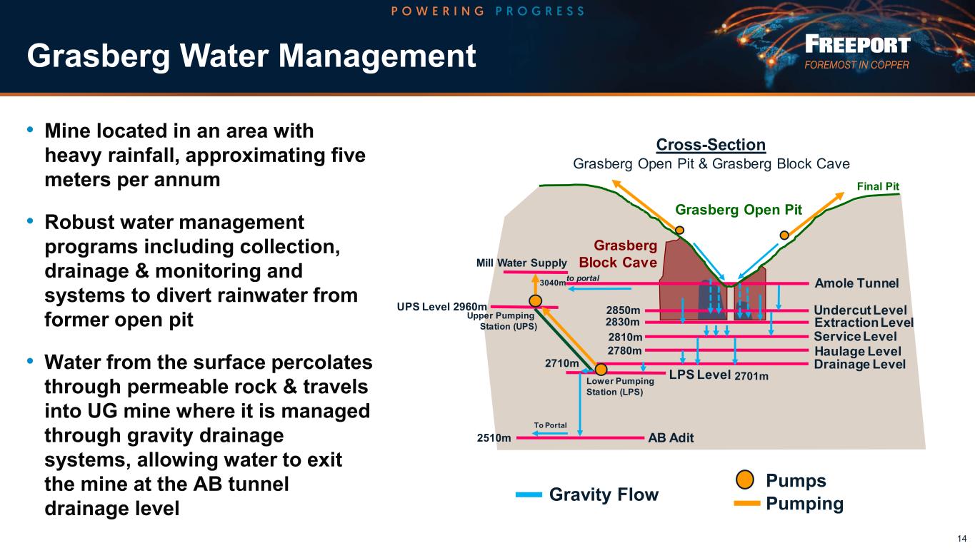 External Mud Rush v. Wet Muck Incidents 13 • Wet Muck Event ✓ Water from the surface percolates through permeable rock & travels into UG mine where it is managed through gravity drainage systems ✓ Some areas of the orebody generate fine material at the drawpoint ✓ When water moves down through broken rock in the cave & encounters fine material, wet muck spills are possible & generally limited to volume of the drawbell PTFI has safety controls & work practices to protect our people from the risk of localized wet muck flows • External Mud Rush Event ✓ Large volume of flowable mud traveling downward from the surface through vertical pathway Nature of the mud rush incident was unique in PTFI’s long underground history & different from wet muck incidents PTFI routinely manages Remote Loading on Extraction Level Remotely controlled Rock Breakers Autonomous Train Haulage Remote Train Loading Spillminator (wet muck control chute)