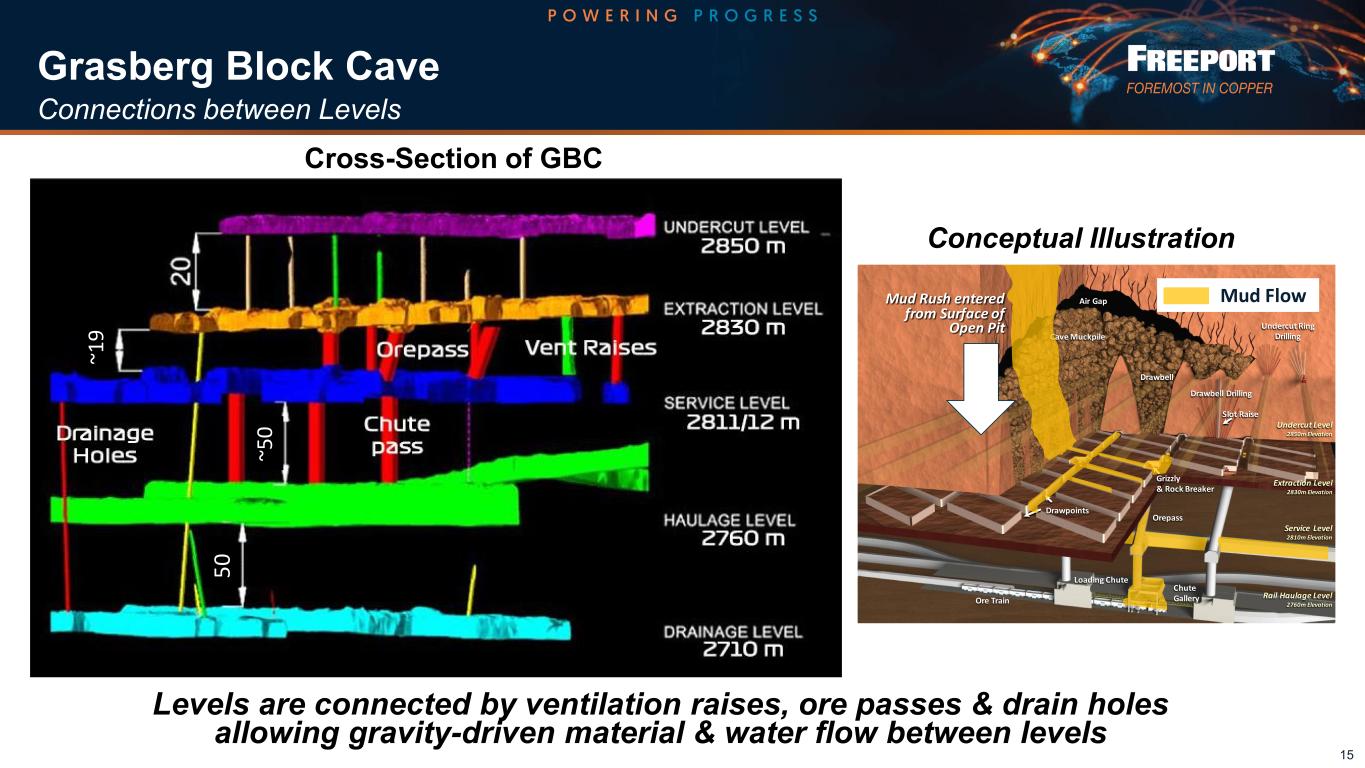 Grasberg Block Cave Levels are connected by ventilation raises, ore passes & drain holes allowing gravity-driven material & water flow between levels Cross-Section of GBC Drawbell Drilling Undercut Ring DrillingCave Muckpile Air Gap Undercut Level 2850m Elevation Extraction Level 2830m Elevation Service Level 2810m Elevation Rail Haulage Level 2760m Elevation Orepass Chute GalleryOre Train Slot Raise Grizzly & Rock Breaker Drawpoints Loading Chute Drawbell l i l i l i l i Mud FlowMud Rush entered from Surface of Open Pit 15 5 0 ~5 0 ~1 9 Conceptual Illustration Connections between Levels