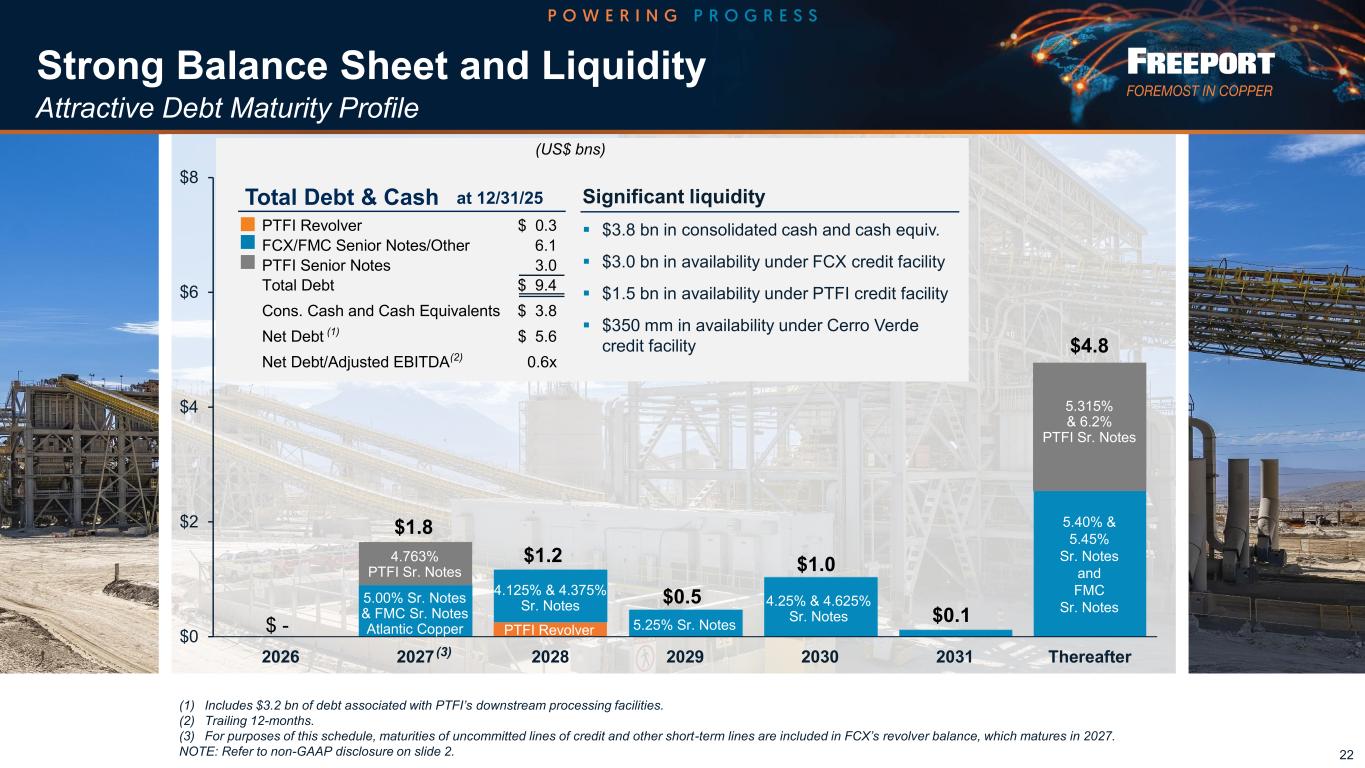 Financial Highlights 21 Copper Consolidated Volumes, excluding purchases (mm lbs) 709 3,574 Average Realization (per lb) $ 5.33 $ 4.75 Site Production & Delivery Costs (per lb) $ 3.05 $ 2.75 Unit Net Cash Costs (per lb) $ 2.22 $ 1.65 Gold Consolidated Volumes (000’s ozs) 80 1,066 Average Realization (per oz) $4,078 $3,423 Molybdenum Consolidated Volumes (mm lbs) 22 83 Average Realization (per lb) $23.77 $22.63 4Q25 (1) Excludes idle facility costs and direct recovery expenses associated with mud rush incident at PTFI. (2) Net of working capital and other uses of $0.8 bn for 4Q25 and $1.3 bn for 2025. (3) Includes $3.2 bn of debt associated with PTFI’s downstream processing facilities. NOTE: Refer to non-GAAP disclosure on slide 2. Revenues $ 5.6 $ 25.9 Net Income Attributable to Common Stock $ 0.4 $ 2.2 Diluted Net Income Per Share $ 0.28 $ 1.52 Operating Cash Flows $ 0.7 $ 5.6 Capital Expenditures $ 1.0 $ 4.5 Total Debt $ 9.4 $ 9.4 Cash and Cash Equivalents $ 3.8 $ 3.8 (in billions, except per share amounts) | Sales Data | Financial Results 2025 (3) (1) (2) (1)