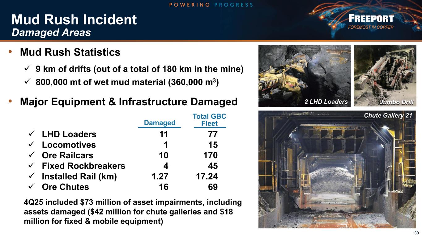 Mud Rush Incident • Mud Rush Statistics ✓ 9 km of drifts (out of a total of 180 km in the mine) ✓ 800,000 mt of wet mud material (360,000 m3) • Major Equipment & Infrastructure Damaged ✓ LHD Loaders 11 77 ✓ Locomotives 1 15 ✓ Ore Railcars 10 170 ✓ Fixed Rockbreakers 4 45 ✓ Installed Rail (km) 1.27 17.24 ✓ Ore Chutes 16 69 4Q25 included $73 million of asset impairments, including assets damaged ($42 million for chute galleries and $18 million for fixed & mobile equipment) 30 Total GBC FleetDamaged Damaged Areas Jumbo Drill2 LHD Loaders Chute Gallery 21