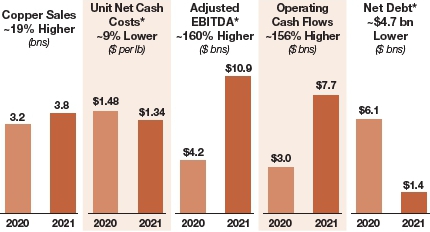 As your Lead Independent Director, I value the ongoing dialogue that Freeport-McMoRan (Freeport) has with our stockholders and the insight and feedback you provide to our board and management team on our company’s practices and your priorities. I am pleased to share several successes that were of particular focus during 2021. The year 2021 was one of strong execution and achievement of significant milestones for Freeport. Critical to our success was the continued prioritization of the health and safety of our workforce and effective management of the impacts of the COVID-19 pandemic on our operating environment. Freeport delivered strong financial and operational performance for the year, including considerable volume growth, effective cost and capital management, and the successful ramp-up of underground production |