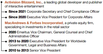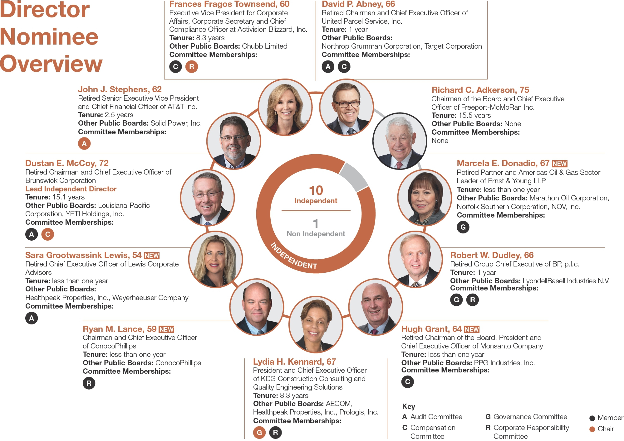at our Grasberg minerals district in Indonesia, an important milestone that positions us to execute on our vision of being foremost in copper. We also strengthened our board during 2021 through the addition of six new independent directors: Bob Dudley and David Abney in April; Marcela Donadio and Sara Grootwassink Lewis in August; Ryan Lance in November; and Hugh Grant in December. Each of these directors brings a unique and complementary set of skills, perspectives and capabilities in a variety of areas and each contributes to our board’s understanding of our complex global business and operating environment, which underpins the board’s effective oversight of our business strategy and priorities. We are proud of our success in cultivating a board that reflects diversity across both professional and personal characteristics. We have an exceptional and highly engaged board focused on the company’s continued success for the benefit of our stockholders and other stakeholders. |