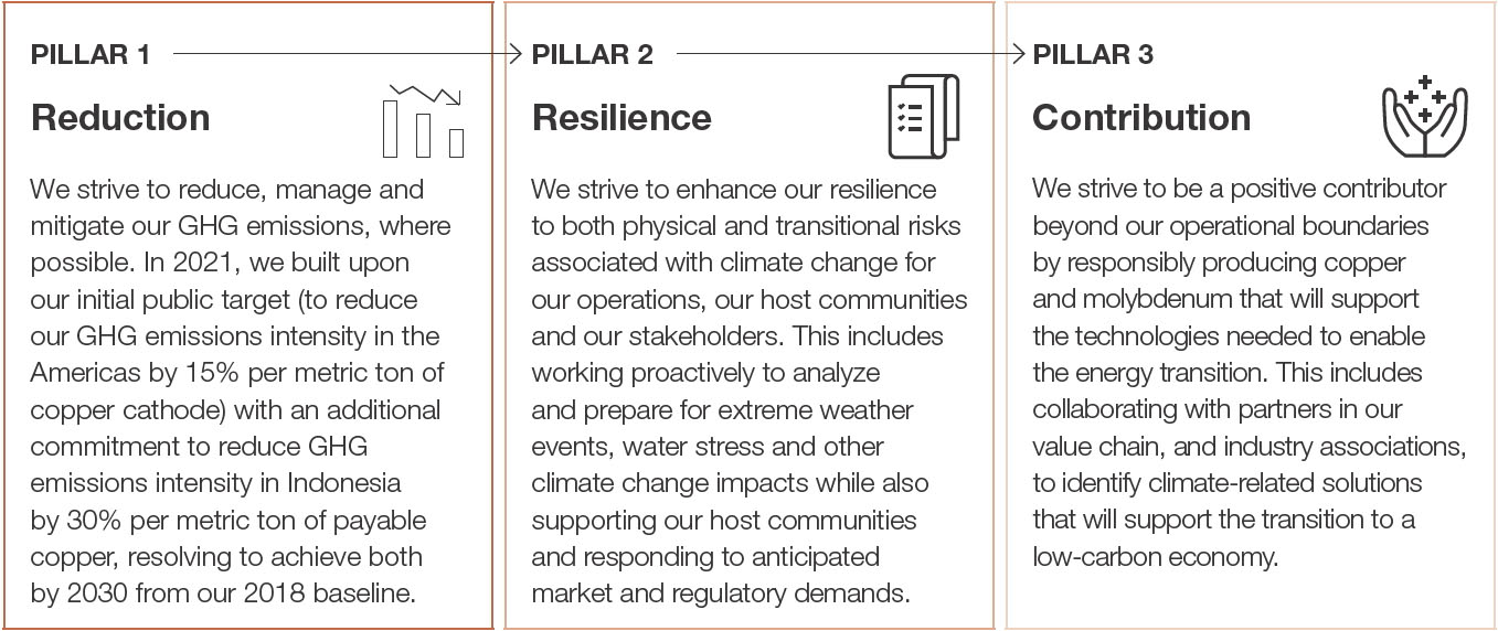 In 2021, Freeport continued to advance environmental, social and governance (ESG) initiatives aligned with our business strategy. We are excited about the role Freeport plays as a leading producer of the metals essential to support the global energy transition and the associated growth opportunities for our business. In September, we published our updated Climate Report, which details our strategy to reduce our greenhouse gas (GHG) emissions and enhance the climate resilience of our business operations. This report reflects our continued progress towards alignment with the recommendations of the Task Force on Climate-related Financial Disclosures (TCFD), including the completion of our first global climate scenario analysis. The company also established a new 30% GHG emissions intensity reduction target for our PT Freeport Indonesia (PT-FI) operations by 2030, and announced our aspiration to participate in, and positively contribute to, a 2050 |