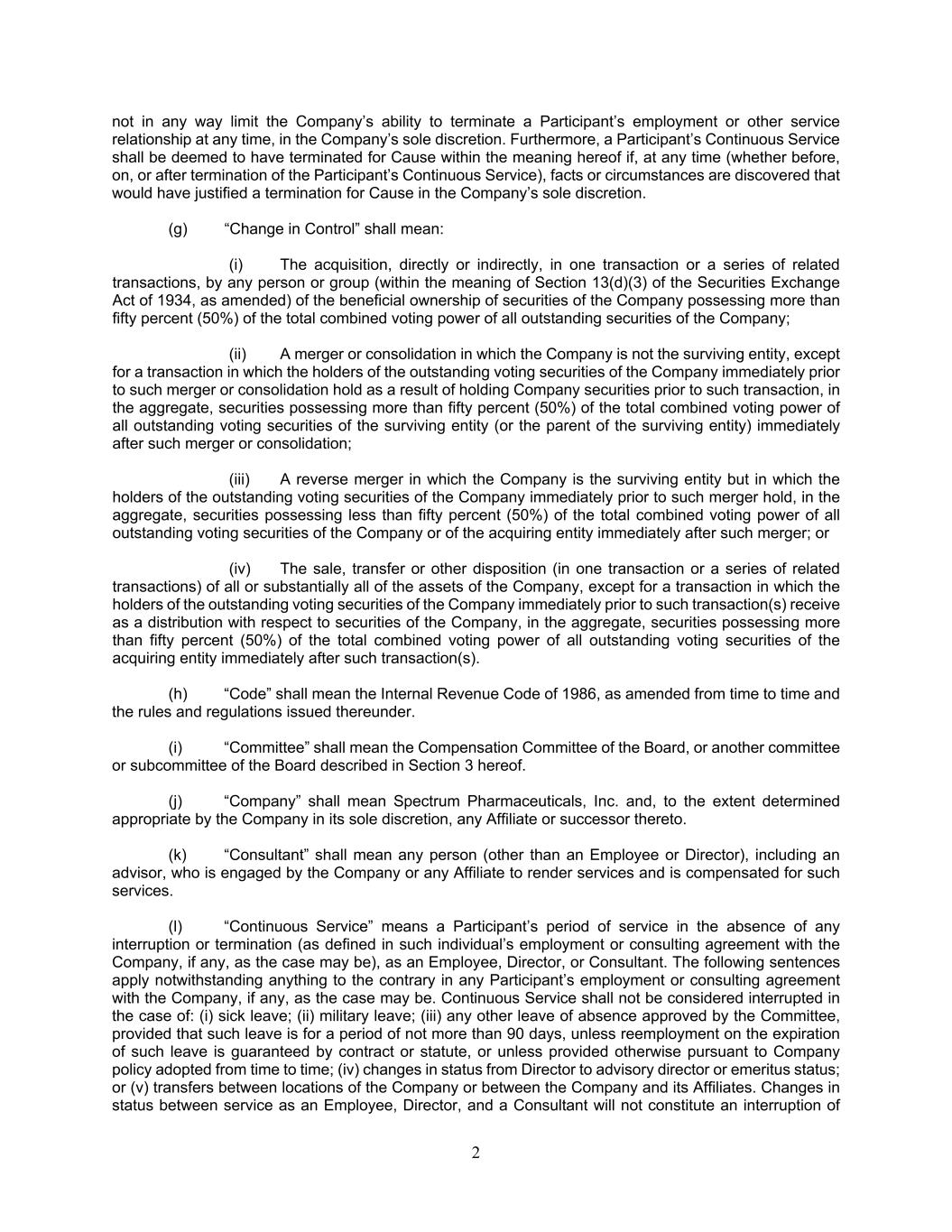 2 not in any way limit the Company’s ability to terminate a Participant’s employment or other service relationship at any time, in the Company’s sole discretion. Furthermore, a Participant’s Continuous Service shall be deemed to have terminated for Cause within the meaning hereof if, at any time (whether before, on, or after termination of the Participant’s Continuous Service), facts or circumstances are discovered that would have justified a termination for Cause in the Company’s sole discretion. (g) “Change in Control” shall mean: (i) The acquisition, directly or indirectly, in one transaction or a series of related transactions, by any person or group (within the meaning of Section 13(d)(3) of the Securities Exchange Act of 1934, as amended) of the beneficial ownership of securities of the Company possessing more than fifty percent (50%) of the total combined voting power of all outstanding securities of the Company; (ii) A merger or consolidation in which the Company is not the surviving entity, except for a transaction in which the holders of the outstanding voting securities of the Company immediately prior to such merger or consolidation hold as a result of holding Company securities prior to such transaction, in the aggregate, securities possessing more than fifty percent (50%) of the total combined voting power of all outstanding voting securities of the surviving entity (or the parent of the surviving entity) immediately after such merger or consolidation; (iii) A reverse merger in which the Company is the surviving entity but in which the holders of the outstanding voting securities of the Company immediately prior to such merger hold, in the aggregate, securities possessing less than fifty percent (50%) of the total combined voting power of all outstanding voting securities of the Company or of the acquiring entity immediately after such merger; or (iv) The sale, transfer or other disposition (in one transaction or a series of related transactions) of all or substantially all of the assets of the Company, except for a transaction in which the holders of the outstanding voting securities of the Company immediately prior to such transaction(s) receive as a distribution with respect to securities of the Company, in the aggregate, securities possessing more than fifty percent (50%) of the total combined voting power of all outstanding voting securities of the acquiring entity immediately after such transaction(s). (h) “Code” shall mean the Internal Revenue Code of 1986, as amended from time to time and the rules and regulations issued thereunder. (i) “Committee” shall mean the Compensation Committee of the Board, or another committee or subcommittee of the Board described in Section 3 hereof. (j) “Company” shall mean Spectrum Pharmaceuticals, Inc. and, to the extent determined appropriate by the Company in its sole discretion, any Affiliate or successor thereto. (k) “Consultant” shall mean any person (other than an Employee or Director), including an advisor, who is engaged by the Company or any Affiliate to render services and is compensated for such services. (l) “Continuous Service” means a Participant’s period of service in the absence of any interruption or termination (as defined in such individual’s employment or consulting agreement with the Company, if any, as the case may be), as an Employee, Director, or Consultant. The following sentences apply notwithstanding anything to the contrary in any Participant’s employment or consulting agreement with the Company, if any, as the case may be. Continuous Service shall not be considered interrupted in the case of: (i) sick leave; (ii) military leave; (iii) any other leave of absence approved by the Committee, provided that such leave is for a period of not more than 90 days, unless reemployment on the expiration of such leave is guaranteed by contract or statute, or unless provided otherwise pursuant to Company policy adopted from time to time; (iv) changes in status from Director to advisory director or emeritus status; or (v) transfers between locations of the Company or between the Company and its Affiliates. Changes in status between service as an Employee, Director, and a Consultant will not constitute an interruption of