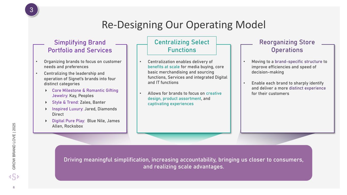 G R O W B R A N D L O V E | 2 0 2 5 O V E R V IE W OUR REVENUE $6.7B FY’25 REVENUE $498M FY’25 ADJUSTED OPERATING INCOME2 8.6%1 ESTIMATED US MARKET SHARE 7.4% FY’25 ADJUSTED OPERATING MARGIN2 $1.0B3 RETURNED TO SHAREHOLDERS IN FY’25 2 POSITIVE SAME STORE SALES 1QTD FY’26 IN BOTH BRIDAL AND FASHION4 2,642 Total Stores 263 Stores in the UK and Republic of Ireland 2,288 Stores in the U. S. 91 Stores in Canada Signet - #1 Jewelry Retailer in the United States 1. Estimated market share is calculated annually. Based on industry and transaction data from MasterCard and market research company Circana, Signet estimates market share based on the Company’s growth rate versus the US jewelry industry 2. See page 9 of this presentation for definition and reconciliation 3. Includes redemption of preferred shares for $814 million, $138 million of common share repurchases, and $49 million of common dividends 4. As of week ending March 15, 2025