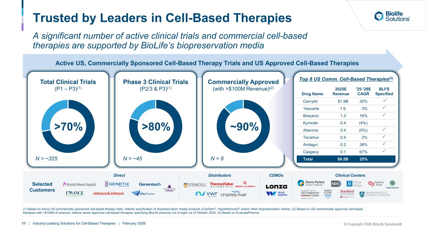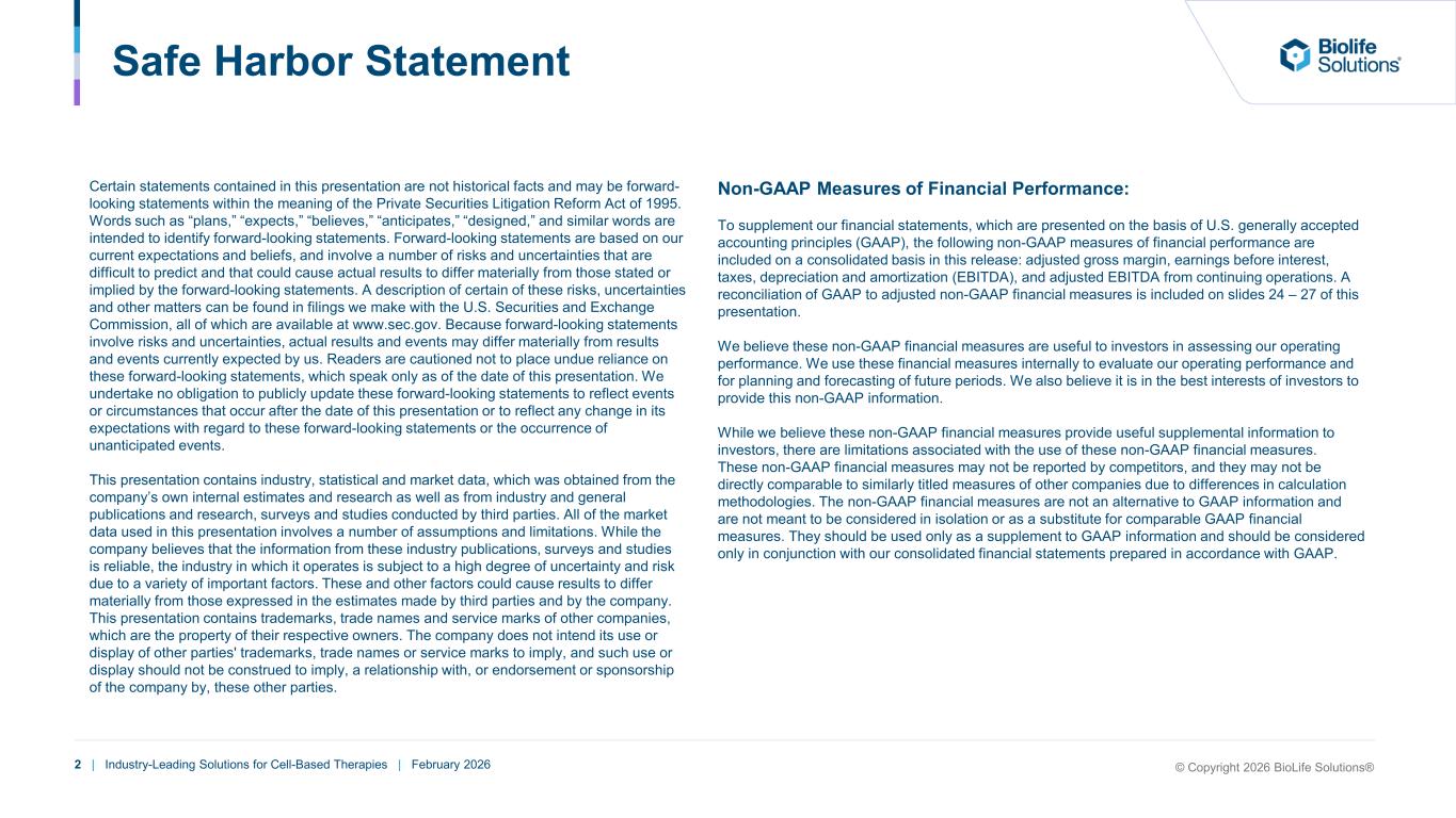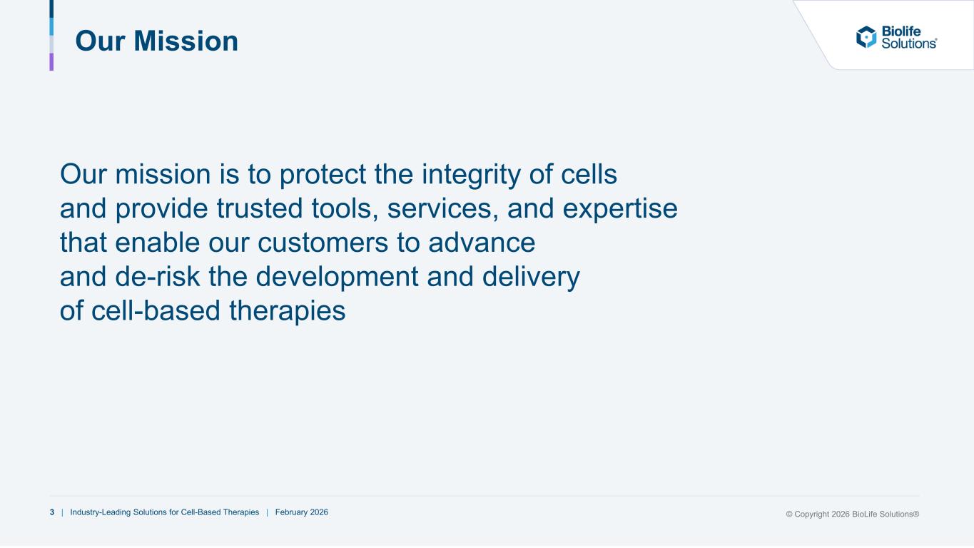 2 | Industry-Leading Solutions for Cell-Based Therapies | February 2026 © Copyright 2026 BioLife Solutions® Safe Harbor Statement Certain statements contained in this presentation are not historical facts and may be forward- looking statements within the meaning of the Private Securities Litigation Reform Act of 1995. Words such as “plans,” “expects,” “believes,” “anticipates,” “designed,” and similar words are intended to identify forward-looking statements. Forward-looking statements are based on our current expectations and beliefs, and involve a number of risks and uncertainties that are difficult to predict and that could cause actual results to differ materially from those stated or implied by the forward-looking statements. A description of certain of these risks, uncertainties and other matters can be found in filings we make with the U.S. Securities and Exchange Commission, all of which are available at www.sec.gov. Because forward-looking statements involve risks and uncertainties, actual results and events may differ materially from results and events currently expected by us. Readers are cautioned not to place undue reliance on these forward-looking statements, which speak only as of the date of this presentation. We undertake no obligation to publicly update these forward-looking statements to reflect events or circumstances that occur after the date of this presentation or to reflect any change in its expectations with regard to these forward-looking statements or the occurrence of unanticipated events. This presentation contains industry, statistical and market data, which was obtained from the company’s own internal estimates and research as well as from industry and general publications and research, surveys and studies conducted by third parties. All of the market data used in this presentation involves a number of assumptions and limitations. While the company believes that the information from these industry publications, surveys and studies is reliable, the industry in which it operates is subject to a high degree of uncertainty and risk due to a variety of important factors. These and other factors could cause results to differ materially from those expressed in the estimates made by third parties and by the company. This presentation contains trademarks, trade names and service marks of other companies, which are the property of their respective owners. The company does not intend its use or display of other parties' trademarks, trade names or service marks to imply, and such use or display should not be construed to imply, a relationship with, or endorsement or sponsorship of the company by, these other parties. Non-GAAP Measures of Financial Performance: To supplement our financial statements, which are presented on the basis of U.S. generally accepted accounting principles (GAAP), the following non-GAAP measures of financial performance are included on a consolidated basis in this release: adjusted gross margin, earnings before interest, taxes, depreciation and amortization (EBITDA), and adjusted EBITDA from continuing operations. A reconciliation of GAAP to adjusted non-GAAP financial measures is included on slides 24 – 27 of this presentation. We believe these non-GAAP financial measures are useful to investors in assessing our operating performance. We use these financial measures internally to evaluate our operating performance and for planning and forecasting of future periods. We also believe it is in the best interests of investors to provide this non-GAAP information. While we believe these non-GAAP financial measures provide useful supplemental information to investors, there are limitations associated with the use of these non-GAAP financial measures. These non-GAAP financial measures may not be reported by competitors, and they may not be directly comparable to similarly titled measures of other companies due to differences in calculation methodologies. The non-GAAP financial measures are not an alternative to GAAP information and are not meant to be considered in isolation or as a substitute for comparable GAAP financial measures. They should be used only as a supplement to GAAP information and should be considered only in conjunction with our consolidated financial statements prepared in accordance with GAAP.