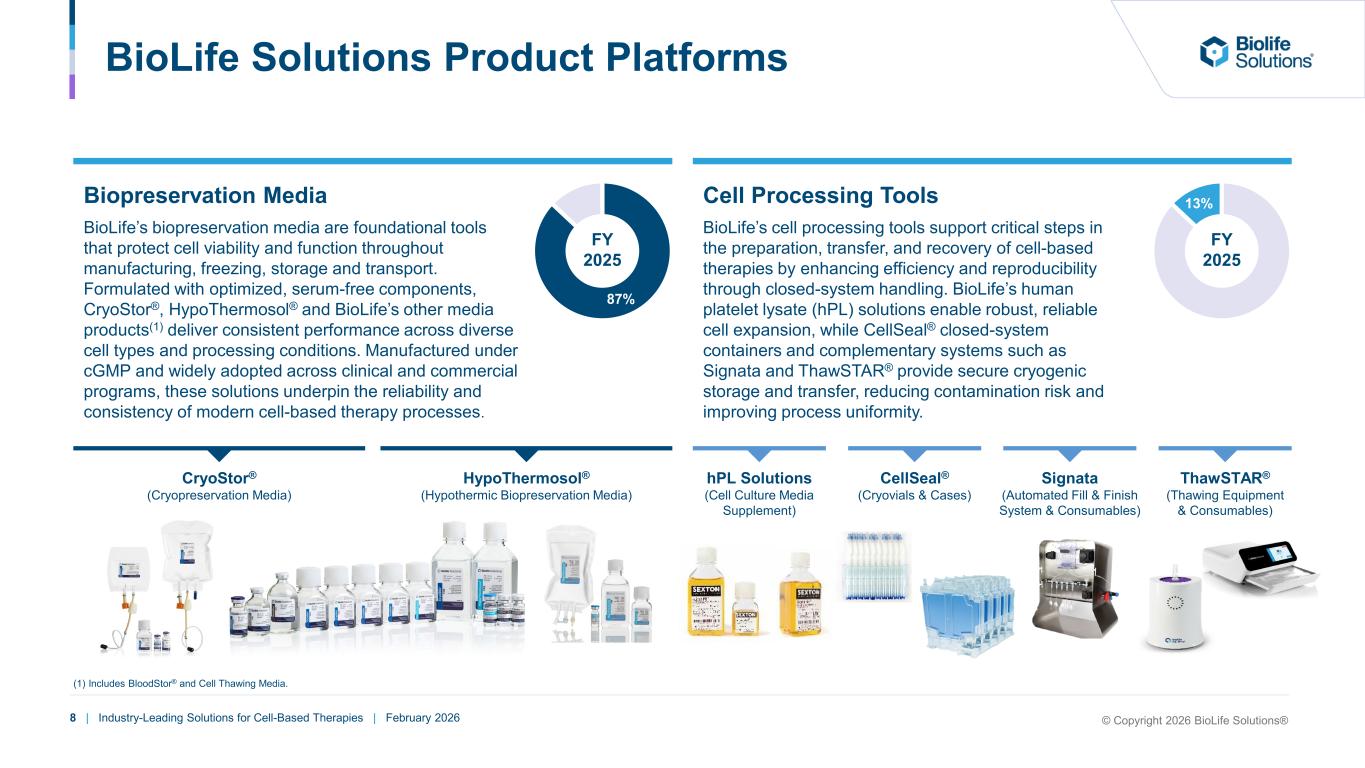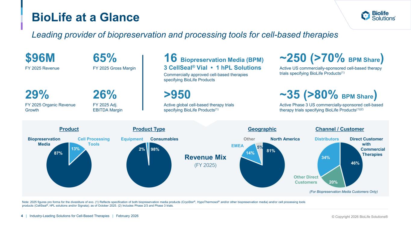 3 | Industry-Leading Solutions for Cell-Based Therapies | February 2026 Our Mission Our mission is to protect the integrity of cells and provide trusted tools, services, and expertise that enable our customers to advance and de-risk the development and delivery of cell-based therapies © Copyright 2026 BioLife Solutions®