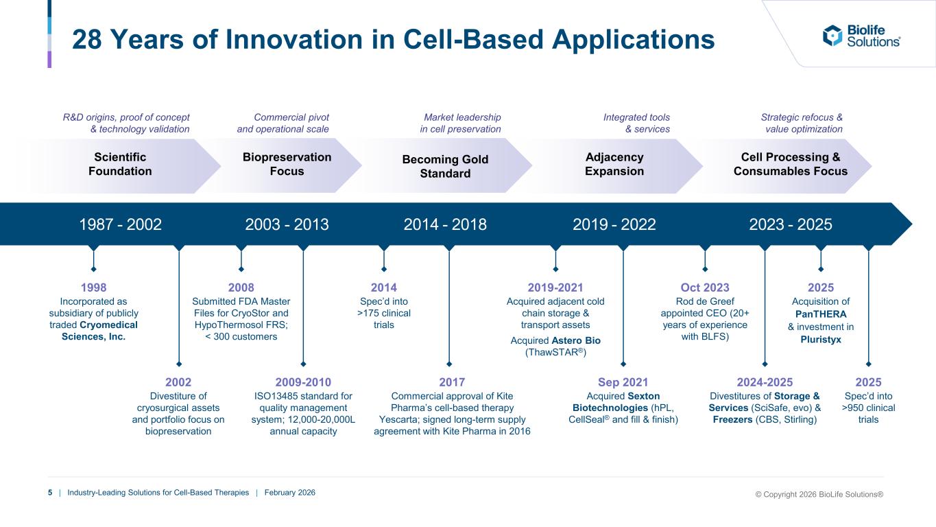 4 | Industry-Leading Solutions for Cell-Based Therapies | February 2026 © Copyright 2026 BioLife Solutions® BioLife at a Glance Leading provider of biopreservation and processing tools for cell-based therapies Note: 2025 figures pro forma for the divestiture of evo. (1) Reflects specification of both biopreservation media products (CryoStor®, HypoThermosol® and/or other biopreservation media) and/or cell processing tools products (CellSeal®, hPL solutions and/or Signata); as of October 2025. (2) Includes Phase 2/3 and Phase 3 trials. Revenue Mix (FY 2025) 13% 87% 98% 2% EquipmentBiopreservation Media ConsumablesCell Processing Tools 46% 20% 34% Direct Customer with Commercial Therapies Distributors Other Direct Customers (For Biopreservation Media Customers Only) $96M FY 2025 Revenue 29% FY 2025 Organic Revenue Growth 26% FY 2025 Adj. EBITDA Margin 65% FY 2025 Gross Margin ~35 (>80% BPM Share) Active Phase 3 US commercially-sponsored cell-based therapy trials specifying BioLife Products(1)(2) >950 Active global cell-based therapy trials specifying BioLife Products(1) 16 Biopreservation Media (BPM) 3 CellSeal® Vial • 1 hPL Solutions Commercially approved cell-based therapies specifying BioLife Products ~250 (>70% BPM Share) Active US commercially-sponsored cell-based therapy trials specifying BioLife Products(1) Product Product Type Geographic 81% 14% 5% North America EMEA Other Channel / Customer