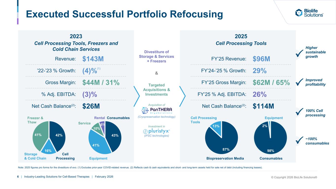5 | Industry-Leading Solutions for Cell-Based Therapies | February 2026 28 Years of Innovation in Cell-Based Applications 1987 - 2002 2003 - 2013 2014 - 2018 2023 - 20252019 - 2022 Scientific Foundation Biopreservation Focus Becoming Gold Standard Adjacency Expansion Cell Processing & Consumables Focus R&D origins, proof of concept & technology validation Commercial pivot and operational scale Market leadership in cell preservation Integrated tools & services Strategic refocus & value optimization 1998 Incorporated as subsidiary of publicly traded Cryomedical Sciences, Inc. 2002 Divestiture of cryosurgical assets and portfolio focus on biopreservation 2008 Submitted FDA Master Files for CryoStor and HypoThermosol FRS; < 300 customers 2009-2010 ISO13485 standard for quality management system; 12,000-20,000L annual capacity 2019-2021 Acquired adjacent cold chain storage & transport assets Acquired Astero Bio (ThawSTAR®) Sep 2021 Acquired Sexton Biotechnologies (hPL, CellSeal® and fill & finish) 2024-2025 Divestitures of Storage & Services (SciSafe, evo) & Freezers (CBS, Stirling) Oct 2023 Rod de Greef appointed CEO (20+ years of experience with BLFS) 2017 Commercial approval of Kite Pharma’s cell-based therapy Yescarta; signed long-term supply agreement with Kite Pharma in 2016 2025 Acquisition of PanTHERA & investment in Pluristyx 2014 Spec’d into >175 clinical trials 2025 Spec’d into >950 clinical trials © Copyright 2026 BioLife Solutions®