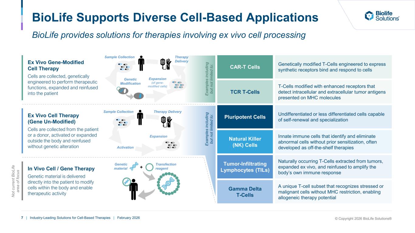6 | Industry-Leading Solutions for Cell-Based Therapies | February 2026 Executed Successful Portfolio Refocusing Note: 2025 figures pro forma for the divestiture of evo. (1) Excludes prior-year COVID-related revenue. (2) Reflects cash & cash equivalents and short- and long-term assets held for sale net of debt (including financing leases). 2023 Cell Processing Tools, Freezers and Cold Chain Services Divestiture of Storage & Services + Freezers Targeted Acquisitions & Investments & (iPSC technologies) (Cryopreservation technology) Acquisition of Investment in 42% 16% 41% 43% 41% 10% 6% Cell Processing Freezer & Thaw Storage & Cold Chain Equipment ConsumablesRental Service 87% 13% 98% 2% Equipment Biopreservation Media Consumables Cell Processing Tools $143M (4)% Revenue: $44M / 31% (3)% ’22-’23 % Growth: % Adj. EBITDA: Net Cash Balance(2): $26M Gross Margin: $96M 29% FY’25 Revenue: $62M / 65% 26% FY’24-’25 % Growth: FY’25 % Adj. EBITDA: Net Cash Balance(2): $114M FY’25 Gross Margin: Higher sustainable growth Improved profitability 100% Cell processing ~100% consumables (1) 2025 Cell Processing Tools © Copyright 2026 BioLife Solutions®