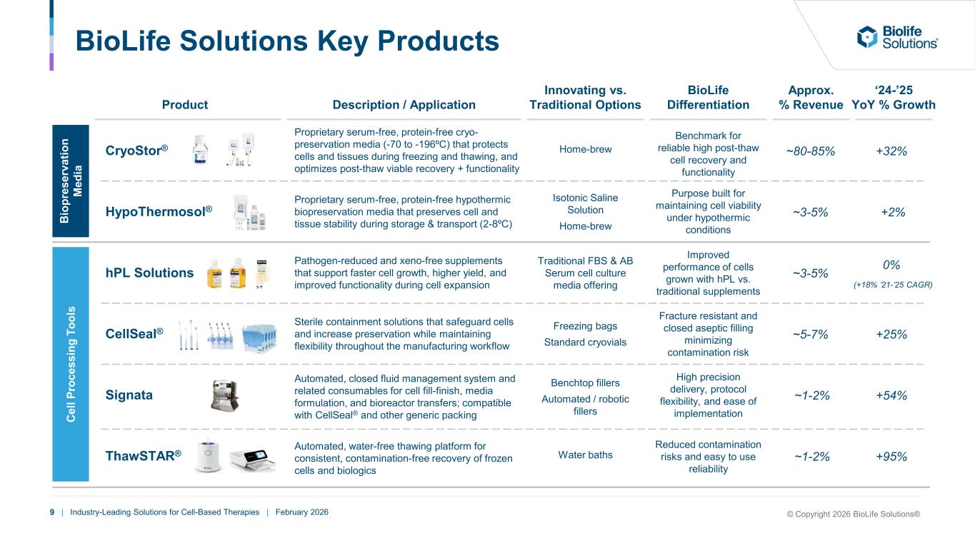 8 | Industry-Leading Solutions for Cell-Based Therapies | February 2026 13% BioLife Solutions Product Platforms Cell Processing Tools BioLife’s cell processing tools support critical steps in the preparation, transfer, and recovery of cell-based therapies by enhancing efficiency and reproducibility through closed-system handling. BioLife’s human platelet lysate (hPL) solutions enable robust, reliable cell expansion, while CellSeal® closed-system containers and complementary systems such as Signata and ThawSTAR® provide secure cryogenic storage and transfer, reducing contamination risk and improving process uniformity. 87% CryoStor® (Cryopreservation Media) HypoThermosol® (Hypothermic Biopreservation Media) hPL Solutions (Cell Culture Media Supplement) CellSeal® (Cryovials & Cases) Signata (Automated Fill & Finish System & Consumables) ThawSTAR® (Thawing Equipment & Consumables) Biopreservation Media BioLife’s biopreservation media are foundational tools that protect cell viability and function throughout manufacturing, freezing, storage and transport. Formulated with optimized, serum-free components, CryoStor®, HypoThermosol® and BioLife’s other media products(1) deliver consistent performance across diverse cell types and processing conditions. Manufactured under cGMP and widely adopted across clinical and commercial programs, these solutions underpin the reliability and consistency of modern cell-based therapy processes. (1) Includes BloodStor® and Cell Thawing Media. FY 2025 FY 2025 © Copyright 2026 BioLife Solutions®