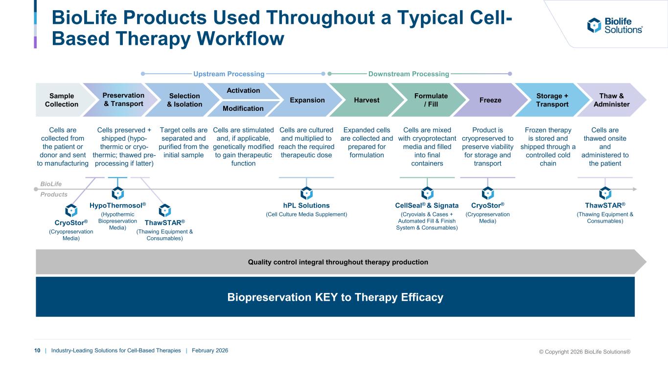 9 | Industry-Leading Solutions for Cell-Based Therapies | February 2026 Pathogen-reduced and xeno-free supplements that support faster cell growth, higher yield, and improved functionality during cell expansion BioLife Differentiation Innovating vs. Traditional Options BioLife Solutions Key Products B io pr es er va tio n M ed ia C el l P ro ce ss in g To ol s Product CryoStor® HypoThermosol® hPL Solutions CellSeal® Signata ThawSTAR® Description / Application Proprietary serum-free, protein-free cryo- preservation media (-70 to -196ºC) that protects cells and tissues during freezing and thawing, and optimizes post-thaw viable recovery + functionality Proprietary serum-free, protein-free hypothermic biopreservation media that preserves cell and tissue stability during storage & transport (2-8ºC) Automated, closed fluid management system and related consumables for cell fill-finish, media formulation, and bioreactor transfers; compatible with CellSeal® and other generic packing Automated, water-free thawing platform for consistent, contamination-free recovery of frozen cells and biologics ‘24-’25 YoY % Growth Approx. % Revenue Purpose built for maintaining cell viability under hypothermic conditions Improved performance of cells grown with hPL vs. traditional supplements Home-brew Isotonic Saline Solution Home-brew Water baths Freezing bags Standard cryovials Benchtop fillers Automated / robotic fillers Sterile containment solutions that safeguard cells and increase preservation while maintaining flexibility throughout the manufacturing workflow Traditional FBS & AB Serum cell culture media offering ~80-85% ~3-5% ~3-5% ~5-7% ~1-2% ~1-2% +32% +2% 0% +25% +54% +95% (+18% ’21-’25 CAGR) Benchmark for reliable high post-thaw cell recovery and functionality Fracture resistant and closed aseptic filling minimizing contamination risk High precision delivery, protocol flexibility, and ease of implementation Reduced contamination risks and easy to use reliability © Copyright 2026 BioLife Solutions®