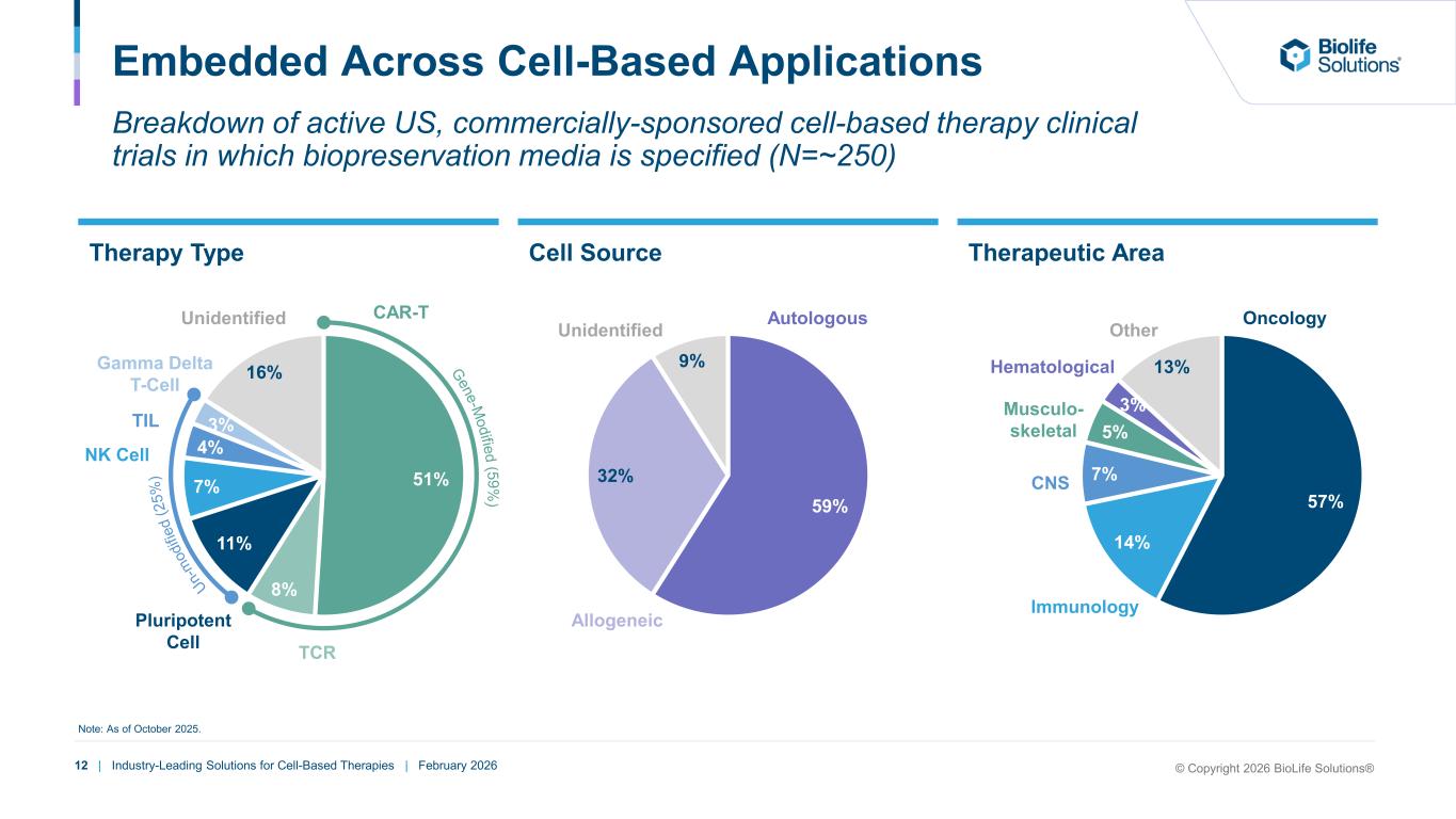 11 | Industry-Leading Solutions for Cell-Based Therapies | February 2026 Active US, Commercially Sponsored Cell-Based Therapy Trials and US Approved Cell-Based Therapies A significant number of active clinical trials and commercial cell-based therapies are supported by BioLife’s biopreservation media Trusted by Leaders in Cell-Based Therapies (1) Based on active US commercially sponsored cell-based therapy trials; reflects specification of biopreservation media products (CryoStor®, Hypothermosol® and/or other biopreservation media). (2) Based on US commercially approved cell-based therapies with >$100M of revenue; reflects seven approved cell-based therapies specifying BioLife products out of eight; as of October 2025. (3) Based on EvaluatePharma. Total Clinical Trials (P1 – P3)(1) Selected Customers Direct Phase 3 Clinical Trials (P2/3 & P3)(1) Commercially Approved (with >$100M Revenue)(2) Top 8 US Comm. Cell-Based Therapies(3) Drug Name 2025E Revenue ’25-’28E CAGR BLFS Specified Carvykti $1.9B 30% Yescarta 1.6B 3% Breyanzi 1.3B 16% Kymriah 0.4B (4%) Abecma 0.4B (0%) Tecartus 0.4B 2% Amtagvi 0.2B 38% Casgevy 0.1B 67% Total $6.5B 25% >70% >80% ~90% Distributors CDMOs Clinical Centers N = ~325 N = ~45 N = 8 © Copyright 2026 BioLife Solutions®